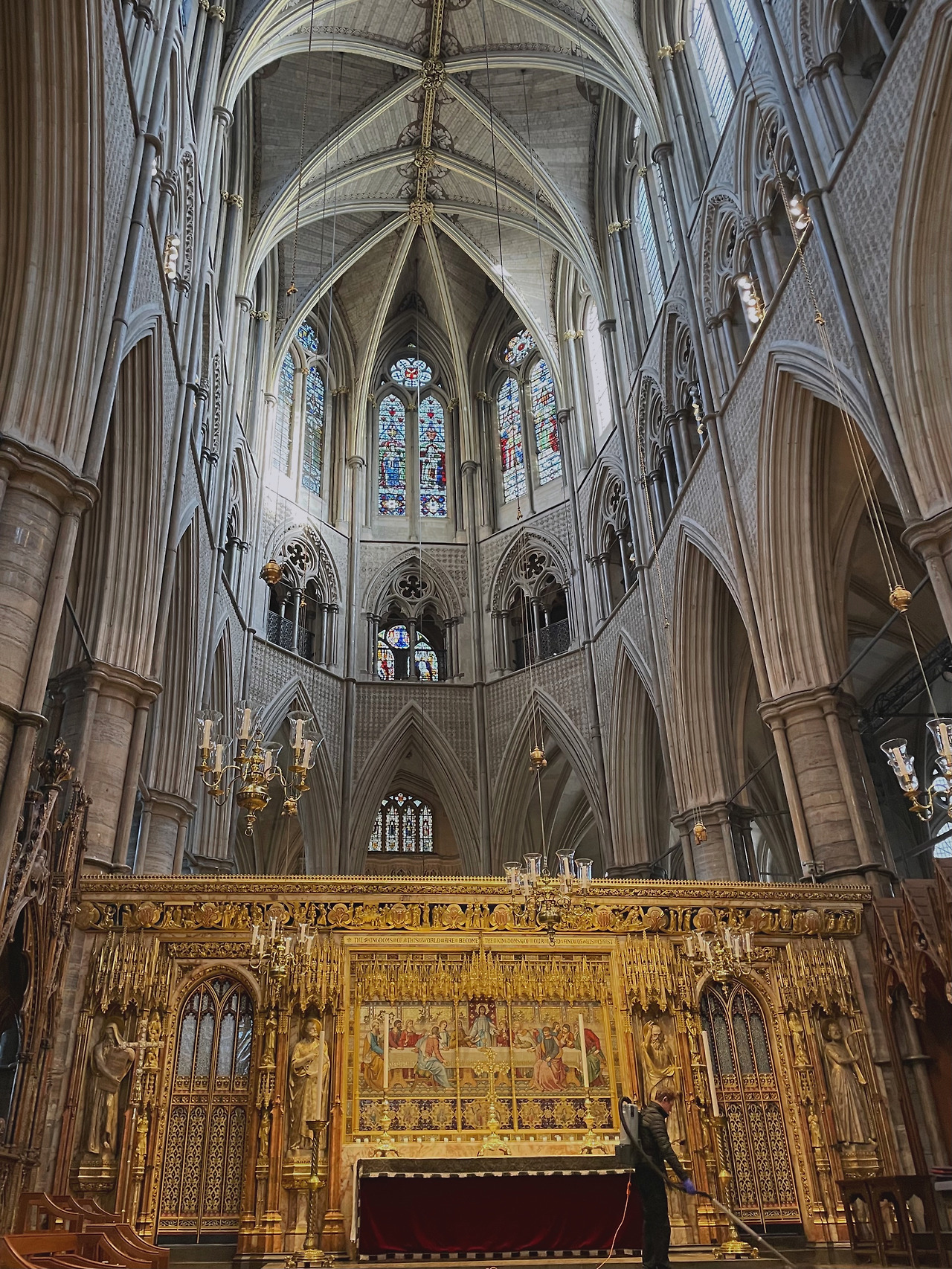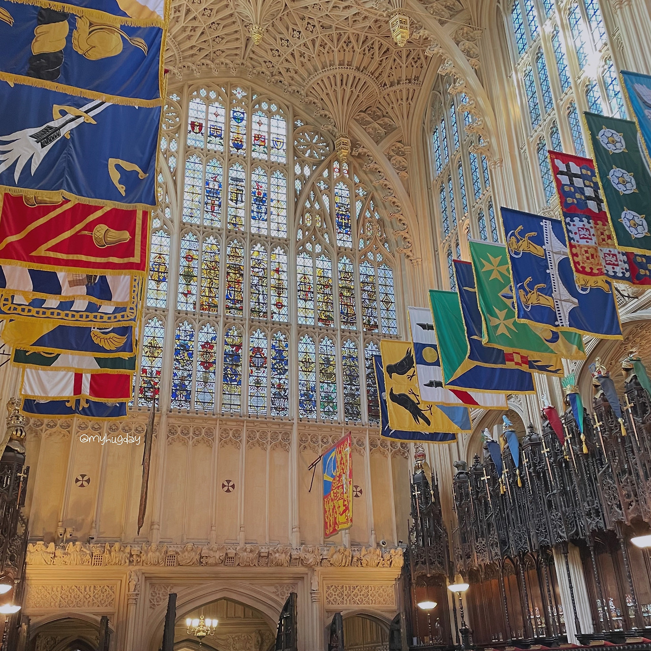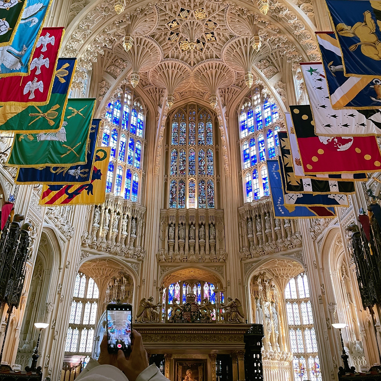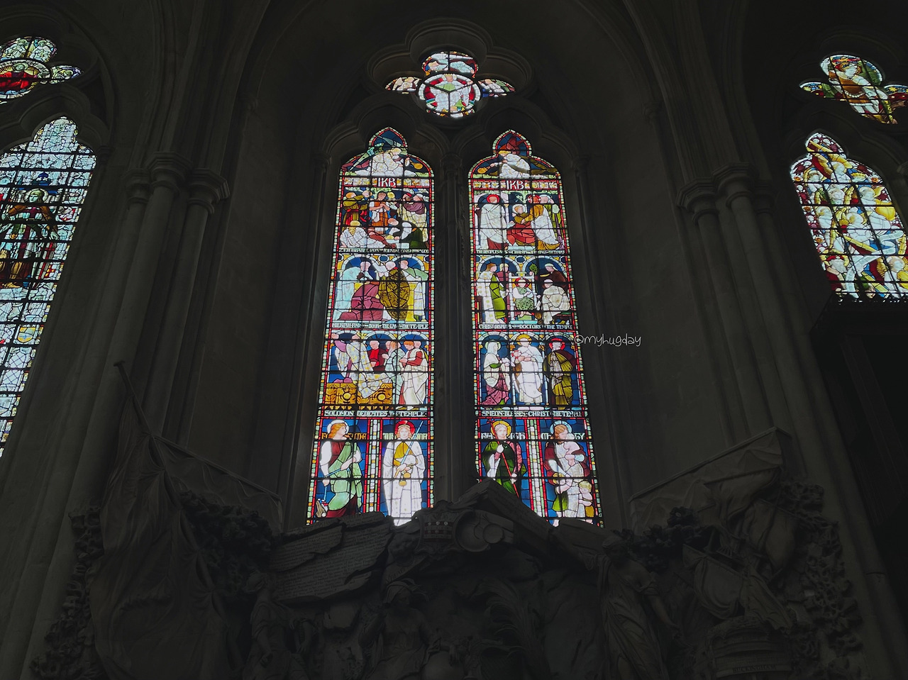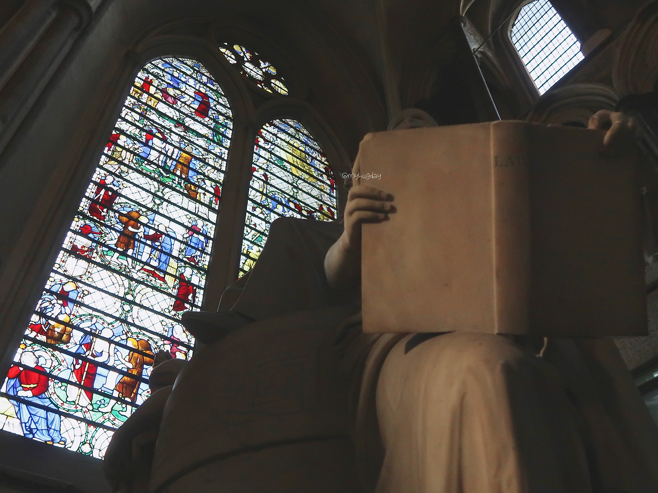 추위에 두 눈이 아려올 때쯤 드디어 입장 차례가 되었다. 설레는 마음을 안고 어두컴컴한 내부로 빨려들 듯 들어갔다. 회중시계를 든 흰 토끼를 따라 토끼굴로 들어가는 기분이 들도록 하는 짧고 어두운 통로를 지나니 이내 매표소 및 사원의 내부가 모습을 드러냈다. 이세계처럼 펼쳐진 사원 내부에는 외벽에 있던 것들보다 더욱 섬세하게 조각된 동상들, 그리고 하늘과 맞닿은 것처럼 저 높이 올려다 보이는 화려한 천장이, 또한 무엇보다도 영롱하게 형형색색으로 빛나는 스테인드 글라스 창이 나의 시선을 압도하였다. 토끼를 따라 이상한 나라에 들어오고 만 앨리스처럼 나는 호기심으로 가득 찬 두 눈을 이리저리 바쁘게 굴렸다. 바깥의 화창한 날씨 덕에 스테인드 글라스 창은 햇살을 받아 그야말로 신의 위용과 신성을 찬란하게 보여주는 듯했다. 하늘 높이 치솟은 천장을 화려하게 지탱하고 있는 슬래브는 그 신의 위용을 더욱 공고히 하며 비종교인인 나 조차도 종교적 신성함과 거룩함을 느끼게 하였다.