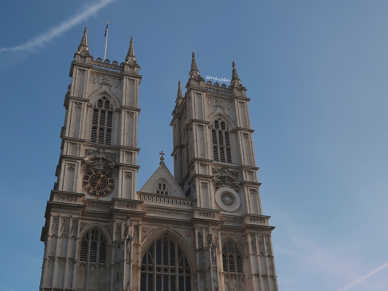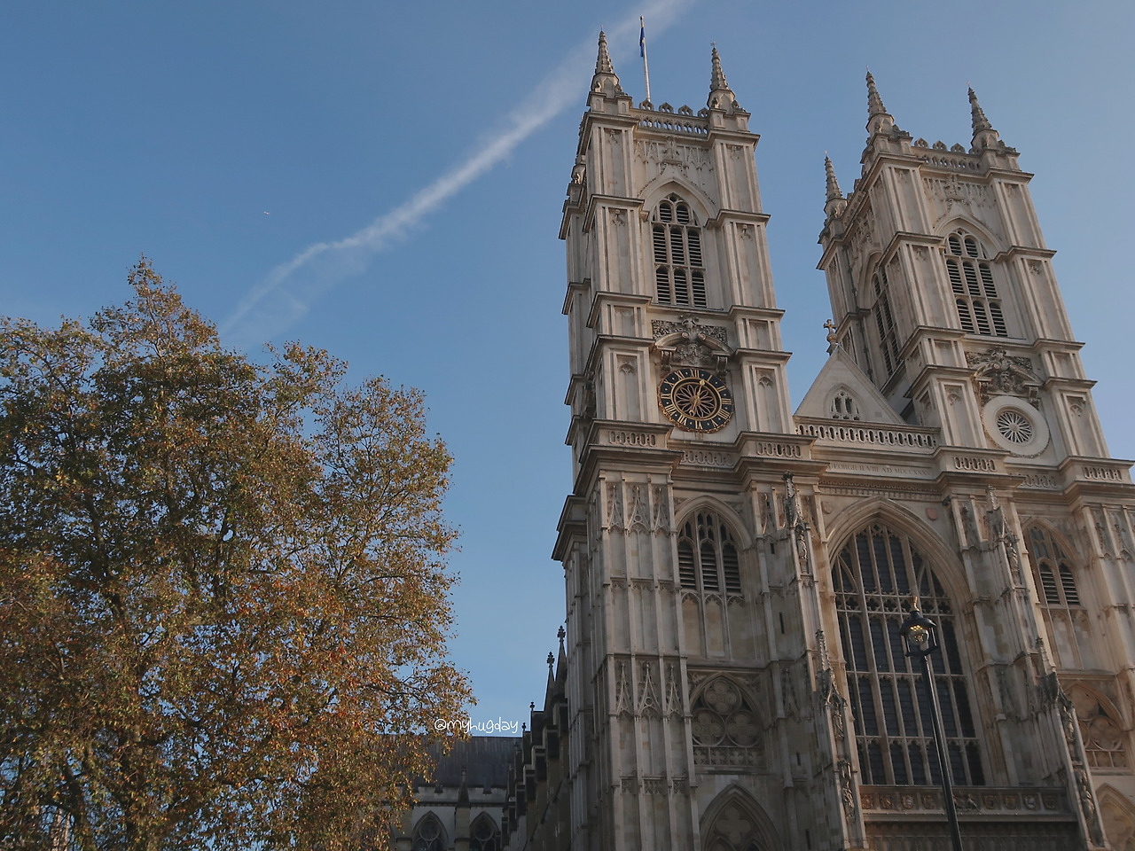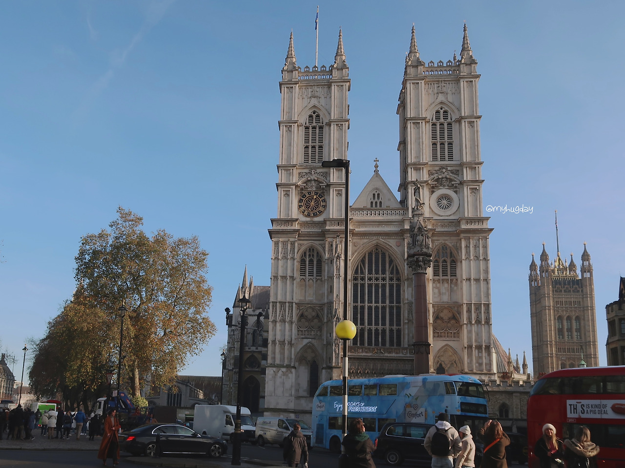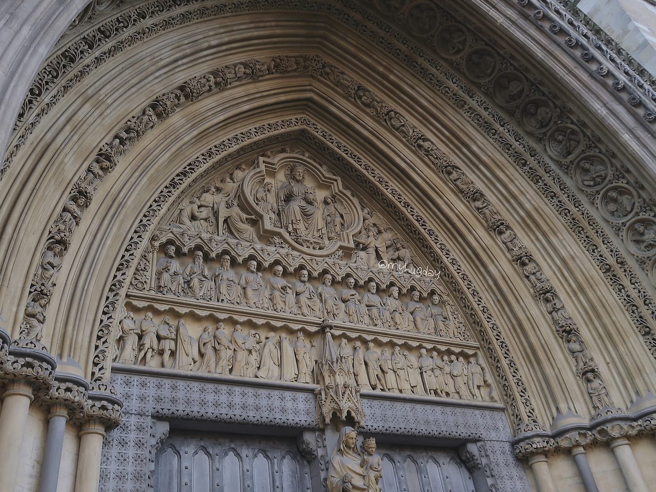 이 거리에서 이곳만 시간이 멈춰 버린 듯 그간의 역사의 위용을 발산하는 웨스트민스터 수도원 정문이 눈앞에 촤르륵 펼쳐졌다. 고딕 양식에 따른 높이 솟은 첨탑과 이를 지탱하는 플라잉 버트레스, 그리고 외벽에 촘촘히 수놓아진 섬세히 세공된 조각 및 동상들은 이 건물의 종교적, 역사적 등의 가치를 떠나 그저 건축의 예술적인 아름다움만을 절로 찬미하게 만들었다. 멀리서 보았을 때는 건축 양식의 전체적인 느낌을 한눈에 살필 수 있었고, 가까이 다가가 보니 그야말로 깨알같이 빼곡하게 채워 넣은 조각품들이 하나하나 모두 섬세하여 구경하기에 더욱 재미있었다. 사원 입장권을 구매하기 위한 대기줄이 꽤 길었지만 이 건물의 외벽과 그 주변의 건축물들을 신나게 살펴보다 보니 대기 시간이 후루룩 지나갔다. 그 와중에 대기줄에 서 있던 어떤 모녀에게 부탁하여 내 사진도 한 장 야무지게 남겼다.