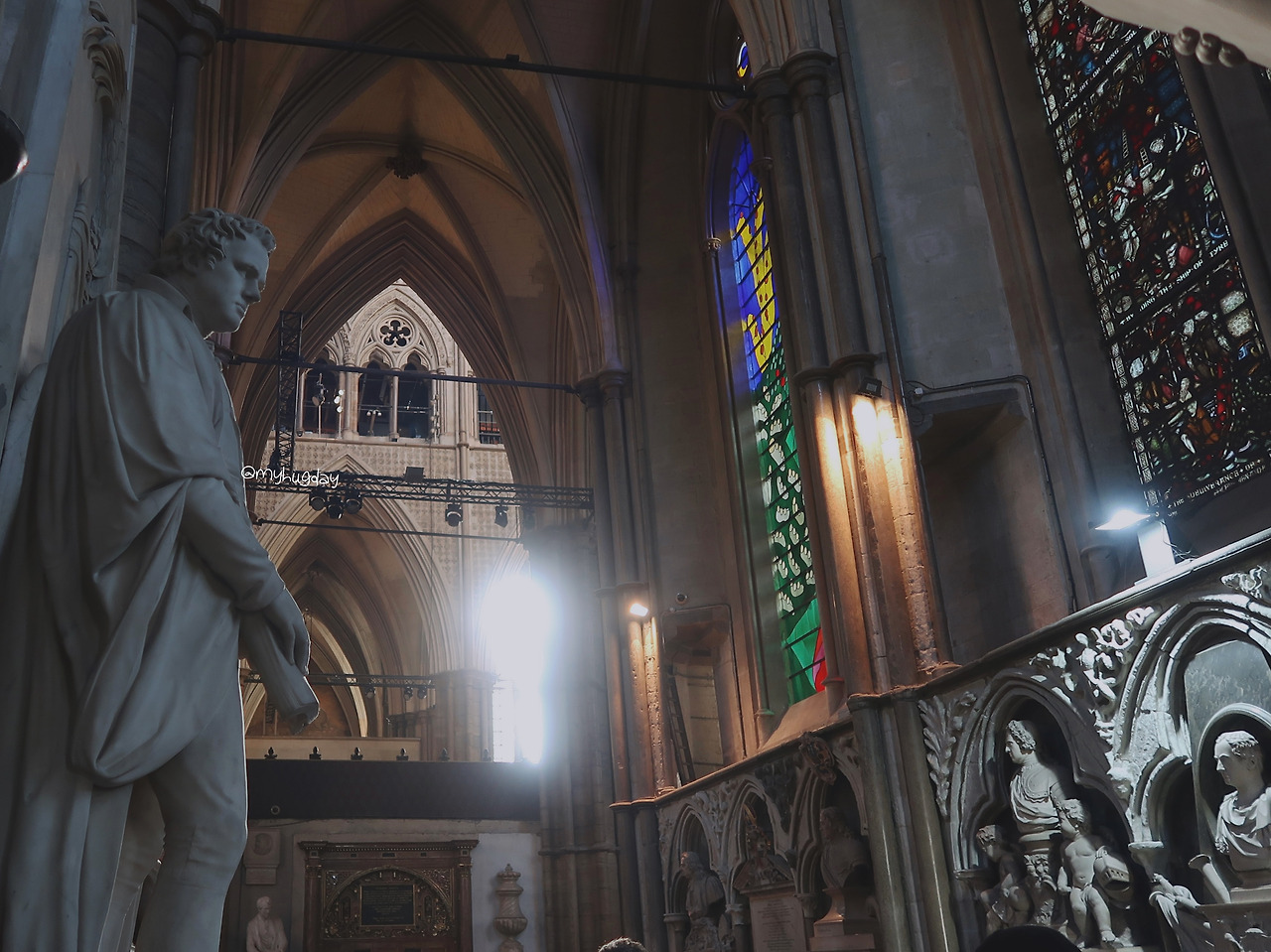 성당 내부를 돌며 수많은 무덤 및 기념상을 마치 예술 작품 감상하듯 찬찬히 살펴보았다. 단순한 기념상이라고 하기에는 매우 섬세하게 공들여 조각되어 있었고 보존 상태도 아주 좋았다. 이곳에는 영국 왕족뿐만 아니라 위인이라고 불리는 사람들도 함께 안치되어 있어, 익숙하다 못해 반갑기까지 한 묘석들을 자주 만날 수 있다. 한 지붕 아래 놓인 이 한 공간 안에 영국의 굵직한 역사가 응축되어 있다고 생각하니 멋지고 대단하면서도 한편으론 이들의 이러한 공간의 존재에 대해 부러움을 느꼈다. 우리나라에도 이런 공간이 있다면 국민들 스스로 조금 더 우리 역사에 대한 자긍심을 고취하고 전통을 계승하는데 도움이 될 수 있을 텐데, 그렇지 아니한 것에 대해 다소 아쉬운 마음이 들었다.