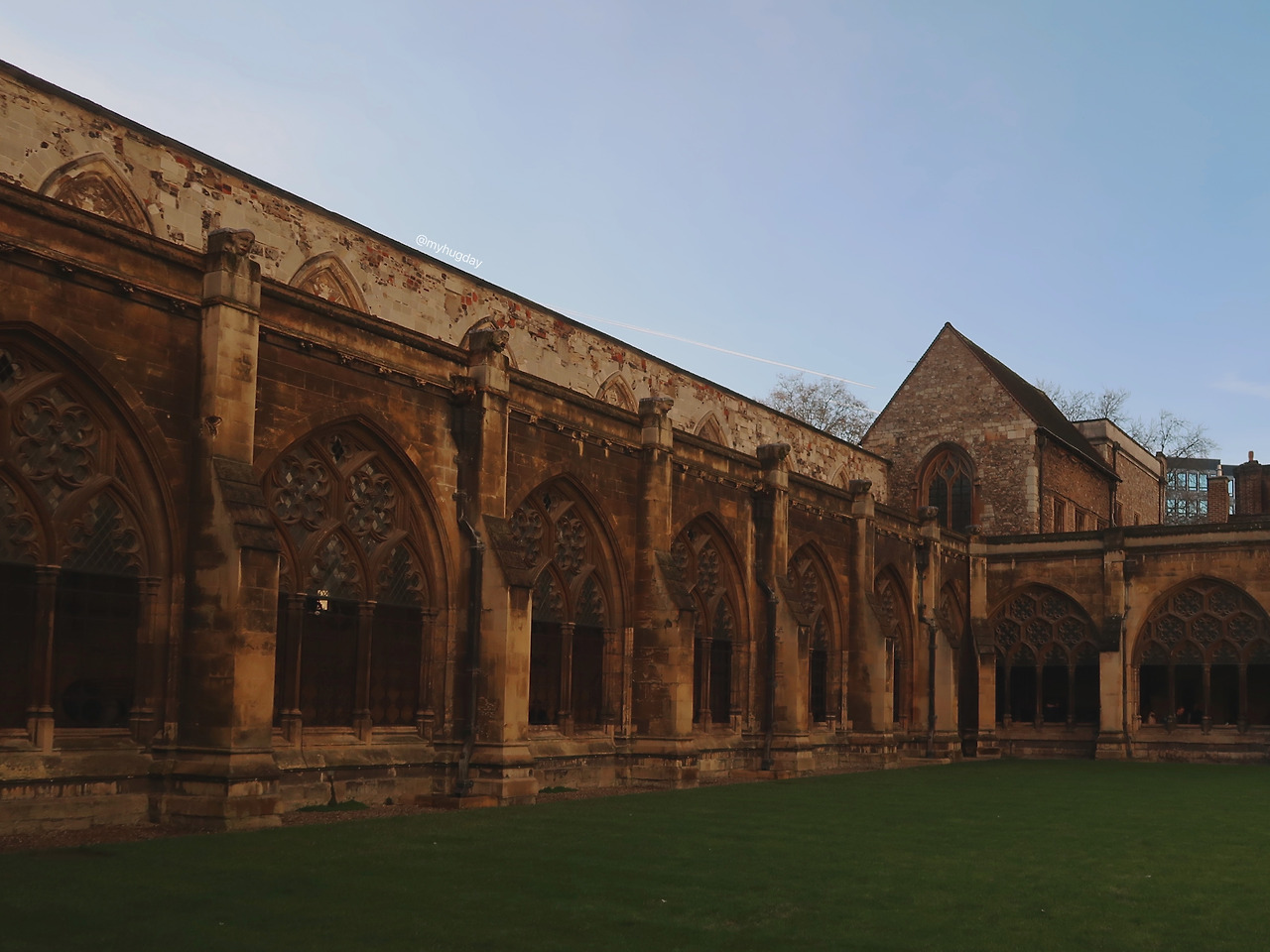 이곳을 떠나기엔 아쉬운 마음이 계속 들었으나 하루 종일 머무를 순 없으니 자리를 박차고 일어나 멀어져 가는 오르간 소리에 간절히 귀를 기울이며 예배당을 벗어났다. 수도원을 나가는 길에 마치 해리포터 속 한 장면을 떠올리게 하는 긴 회랑이 나타났는데 회랑의 창틀 너머로 바라보는 초록빛 잔디가 깔린 안뜰과 그 위로 시원하게 펼쳐진 푸른 하늘, 그리고 유구한 역사를 자랑하는 오래된 수도원 건물의 외관이 멋져서 추운 것도 참아가며 또 한참을 구경하였다. 이곳에서도 역시 또 다른 낯선 이에게 부탁하여 내 사진을 남겼다. 귀엽고 상냥한 그녀는 나의 사진을 열심히 찍어 주었지만 역광 때문에 그다지 만족스러운 결과물은 얻지 못했다.