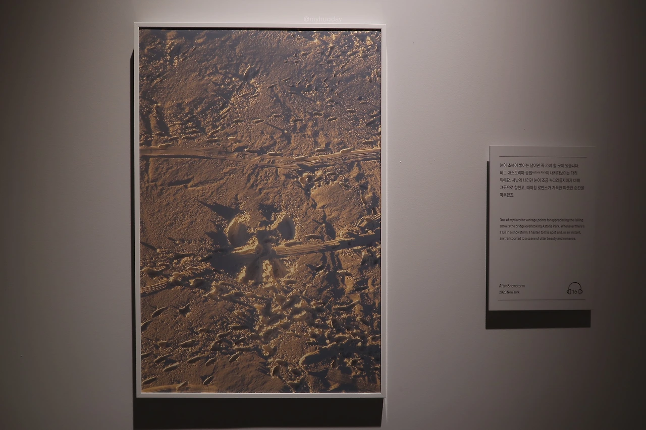 세 번째 챕터 <Rest Stop>에서는 뉴욕 센트럴파크의 푸릇푸릇한 초록빛깔 풍경, 혹은 두근두근 새하얀 풍경을 보여주고 있는데, 그저 전시장 벽에 걸린 사진들을 따라가며 걷는 것만으로도 몸과 마음의 휴식을 취하는 기분이 들었다. 정말 잔디밭에 누워있지 않아도 풀냄새와 산들바람의 감촉이 느껴지는 것 같고, 정말 물속에 몸을 담그고 있지 않아도 물결의 파동이 내 살갗을 에워싸는 것 같았으며, 정말 설원을 뒹굴고 있지 않아도 눈(雪)에 비친 겨울 햇살의 포근함이 내 얼굴 위로 내려앉는 것 같았다.