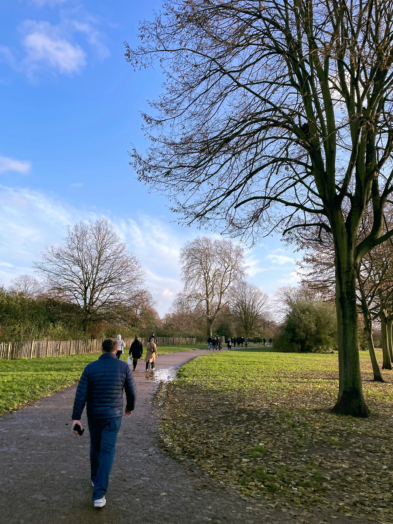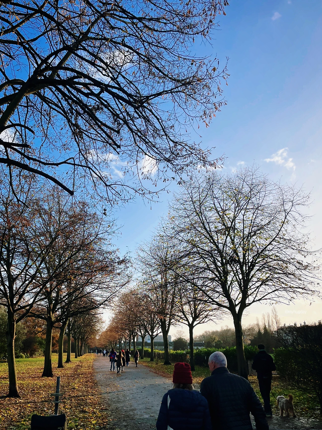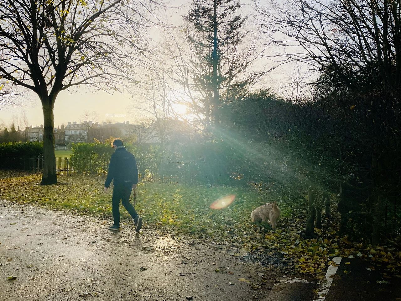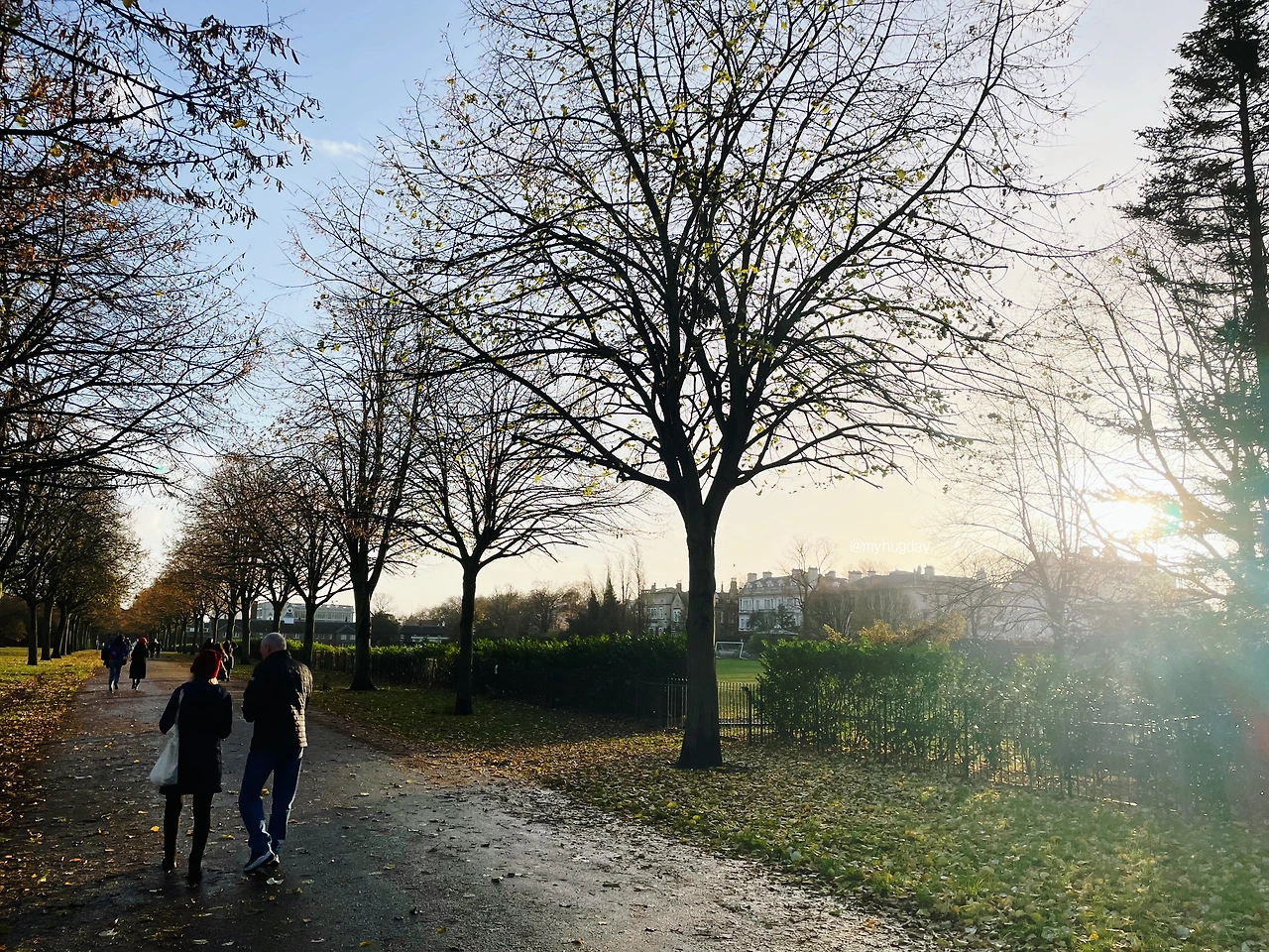 예쁘고 조용한 켄싱턴 주택가를 지나 켄싱턴 공원 앞에 다다랐다. 아직 오후 두 시 삼십 분 정도밖에 되지 않았는데 벌써부터 태양의 황금 이불이 대지를 덮으러 내려오고 있었다. 무성함과는 반대의 모습을 한 겨울나무들의 가지 틈으로 황금 이불자락이 비죽비죽 튀어나왔다. 고층 건물 없이 탁 트인 너른 녹색 들판 위에는 찬란한 금빛 노을이 눈부시게 반짝거렸으며 또한 여유로이 산책을 즐기는 사람들이 이 공원에 더욱더 아기자기한 생기를 부여했다. 나는 맑다 못해 얼음처럼 차가운 공기를 한껏 들이마시며 그 목가적인 오솔길을 즐거이 거닐었다.