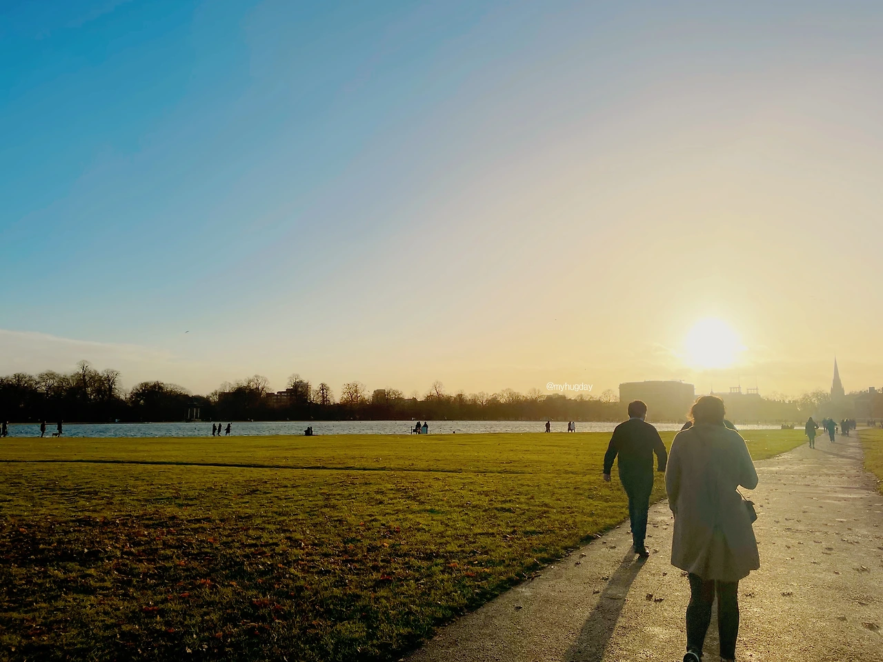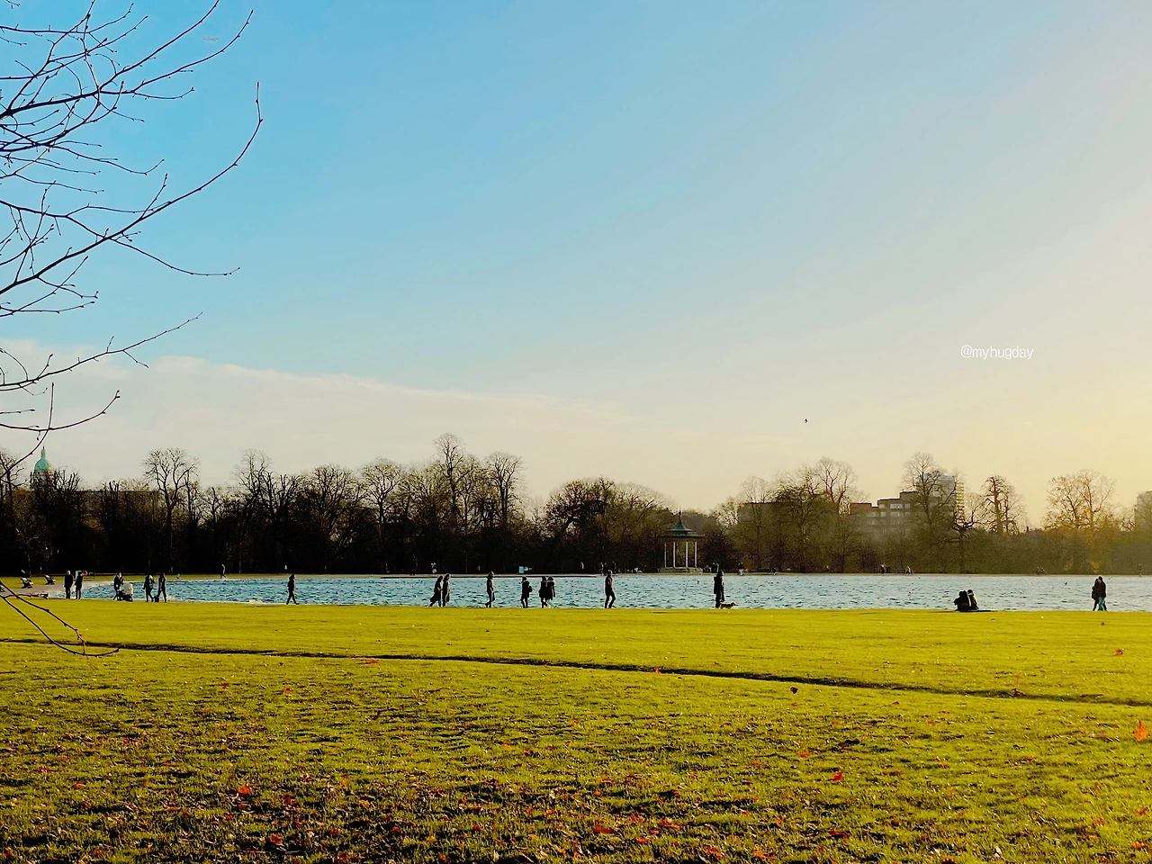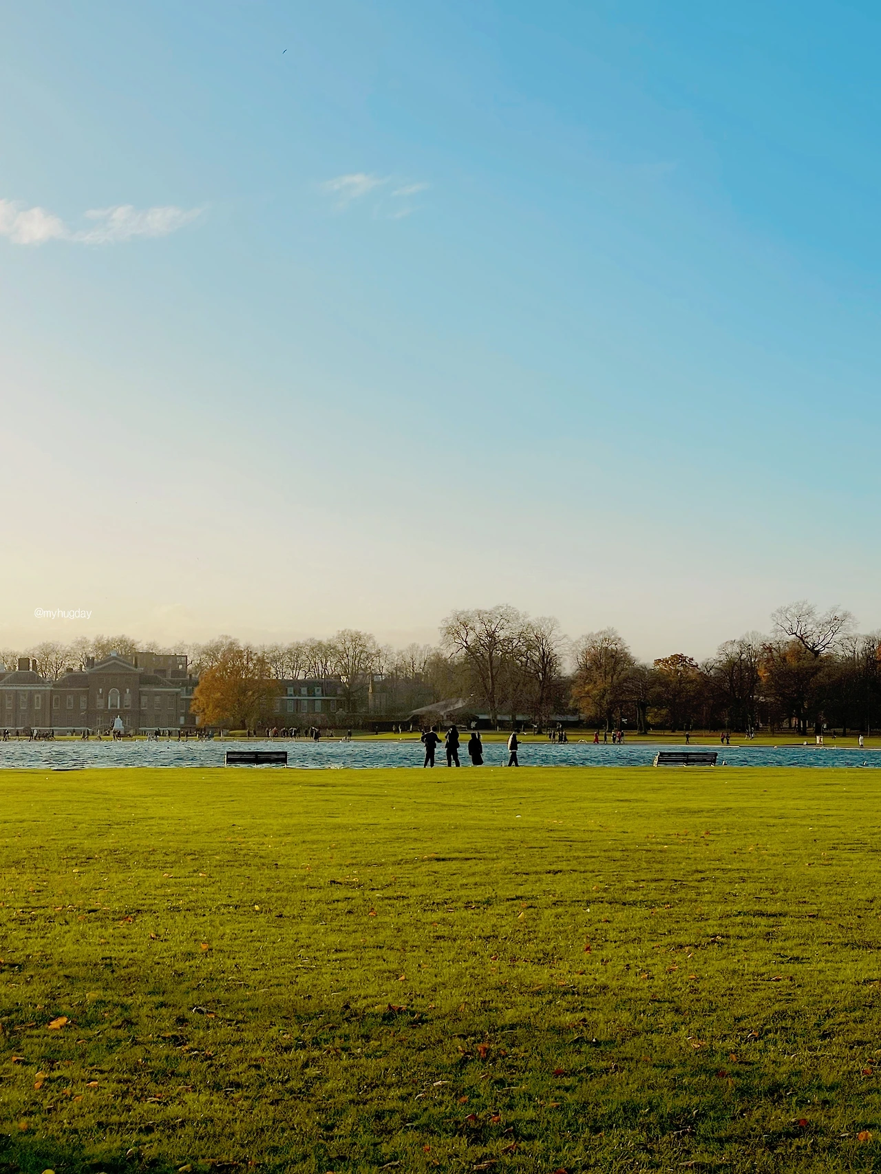 얼마 지나지 않아 커다란 연못(Round Pond)이 나타났다. 연못답게 물살이 아주 거세지는 않았지만 겨울바람으로 인해 나름의 파도를 만들어내고 있었고, 그 위로 금빛 노을이 반짝반짝 부서지며 끊임없는 윤슬을 이루었다. 널따랗고 둥근 연못가로는 사람들과 새들이 한데 어우러져 어떠한 규칙성이 존재하는 모빌처럼 그 주위를 맴돌고 있었다. 무언가 대단한 조형물이 있다든가 압도적인 크기의 광활한 대자연을 형성한다든가 다양한 동식물들이 있는 것도 아닌데 그 공원의 소박하고도 평화로운 풍경이 그만으로도 강한 매력을 이루어 내 맘을 탁 사로잡았다. 새삼 내 취향은 참 별게 아니라 단순하고 소박한 것들에 있다는 생각이 든다. 지나치게 화려한 것들은 물론 아름답지만 나의 눈과 정신을 피로하게 만드는데 반해, 소박한 것들은 봐도 봐도 질리지 않고 마치 늘 나와 함께 했던 나의 일부인 것처럼 편안하다. 그 편안함이 주는 안정감과 고요함, 그리고 그 속에서 은은하게 느껴지는 소박한 기쁨과 행복이 좋다.