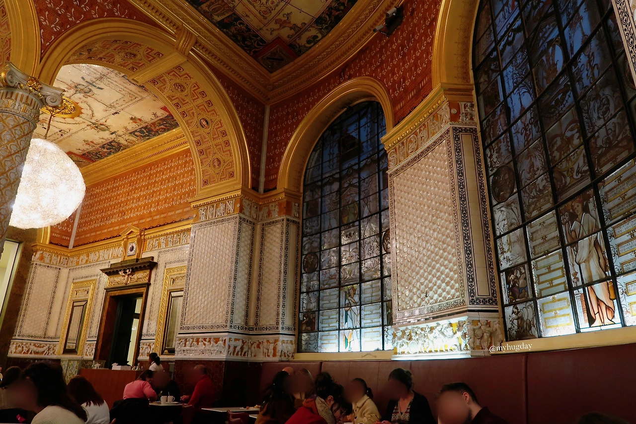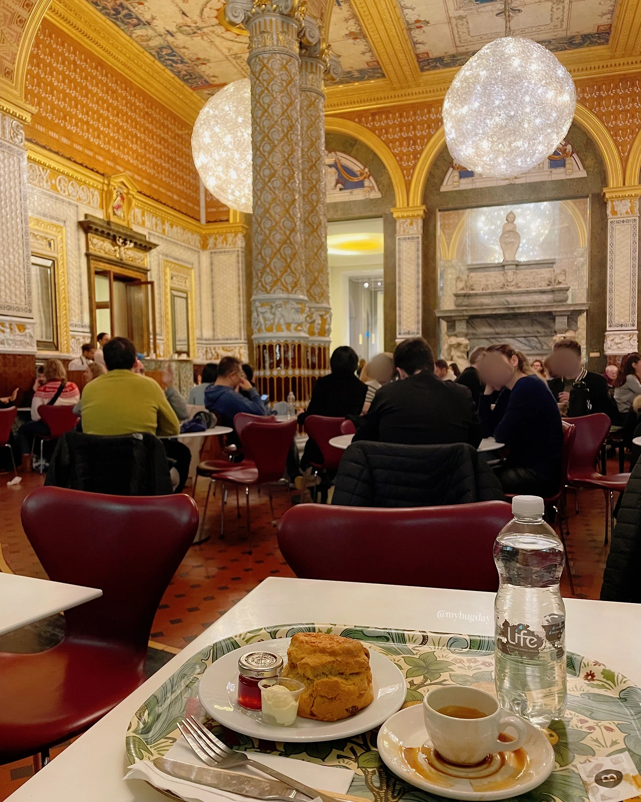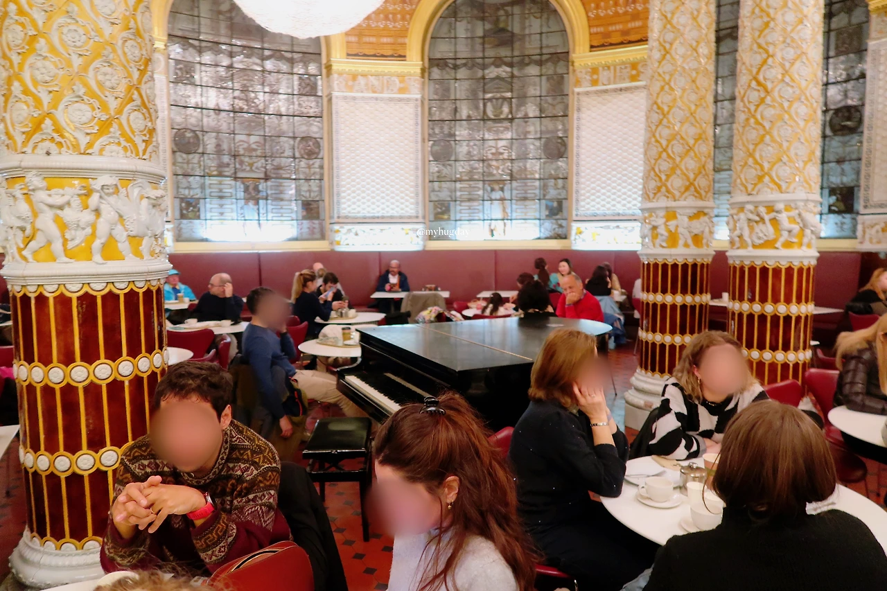 나는 스콘과 에스프레소 한 잔, 그리고 생수 한 병을 주문하여 받아들고는, 홀 한가운데에 그랜드 피아노 한 대가 놓여있는 Gamble Room 안에 착석했다. V&A 카페는 Gamble Room, Morris Room, Poynter Room 총 세 개의 주요 홀로 구성되어 있는데, Gamble Room은 셋 중 특히 빅토리아풍의 화려하고 장식적인 인테리어와 샹들리에, 스테인드글라스, 벽을 채운 예술 작품들로 특색을 이루며 매우 고풍스럽고 아름다운 분위기를 자아내고 있어 많은 사람들에게 인기 있는 홀이기도 하다. 내가 방문했을 당시에는 사람이 너무 많아서였는지 피아노 라이브 연주를 들을 수 없었는데, 가끔 방문객들을 위해 멋진 피아노 연주를 들려주기도 한단다.