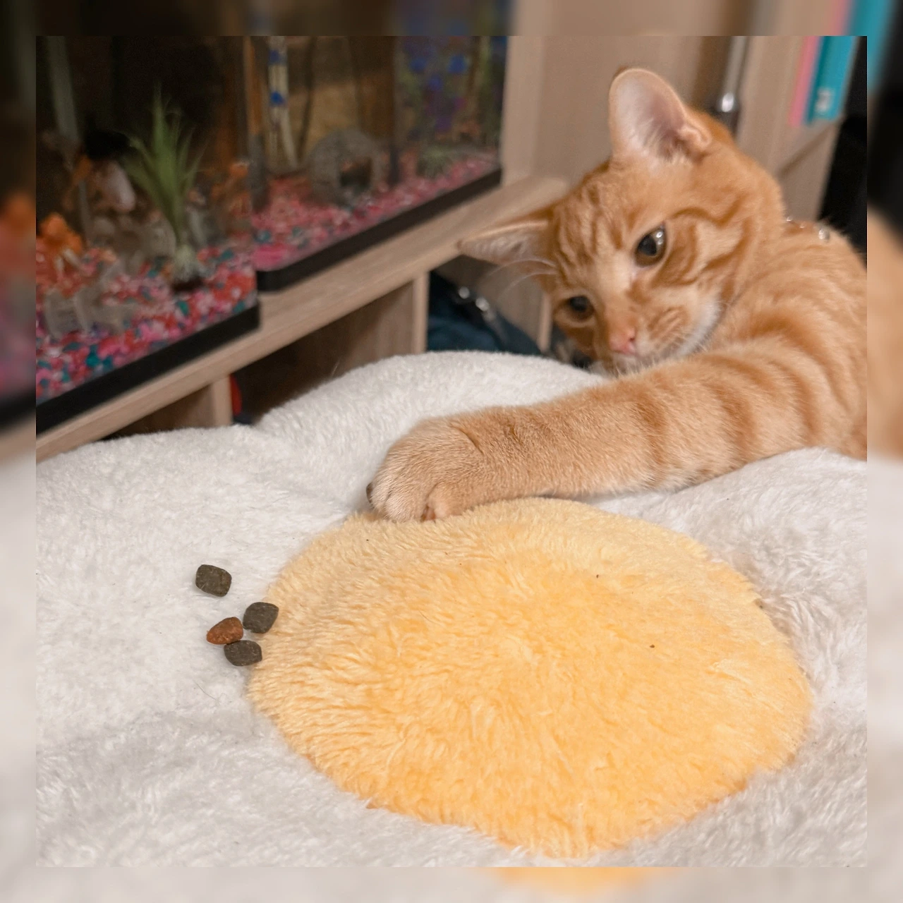 고양이의 스트레스 대처법은 여러 가지가 있겠지만 대표적으로 높이 올라가서 쉴 수 있는 공간을 마련해 주라는 것이었다. 우리 집에는 물론 캣타워가 있지만 책꽂이 위에는 깨질 수 있는 것들이 많아서 뭔가 변화가 필요했다. 아이들 스트레스의 원인이 뭐가 있을까 곰곰이 생각해 보니 가장 먼저 머릿속에 떠오르는 건, 식탐이었다.