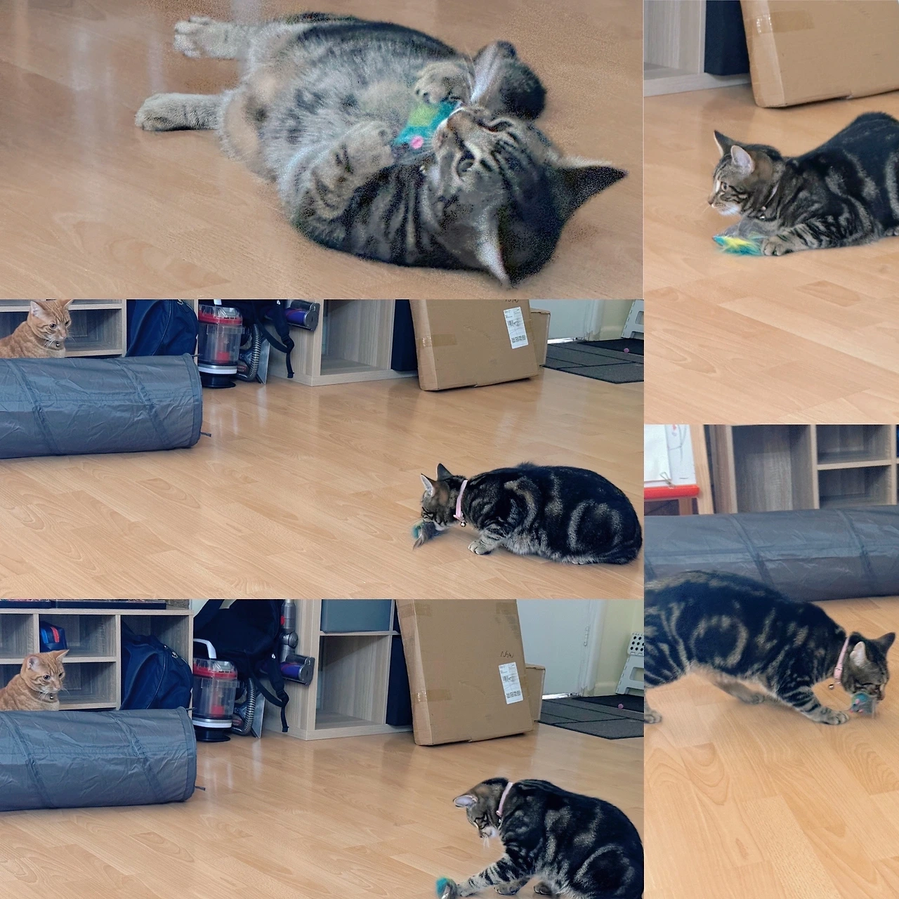 보통 장난감을 주면 주로 서열이 높은 치즈가 가지고 놀다가 고등어의 차례가 돌아오곤 하는데 이번에는 고등어가 치즈에게 차례를 내어주질 않았다. 얼마나 뺏기기 싫었으면 치즈가 뺏으려고 할 때 고등어가 치즈에게 훅(냥펀치)을 날렸다. 그러고는 혹여라도 뺏길까 봐 구석으로 가지고 가서 놀았다.