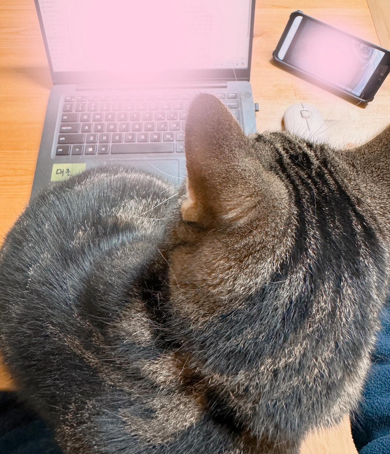 노트북과 나의 거리는 점점 늘어난다. 뭐라도 끄적이려 모니터를 보려면 움직이는 고등어의 머리를 요리조리 잘 피해서 봐야 한다.