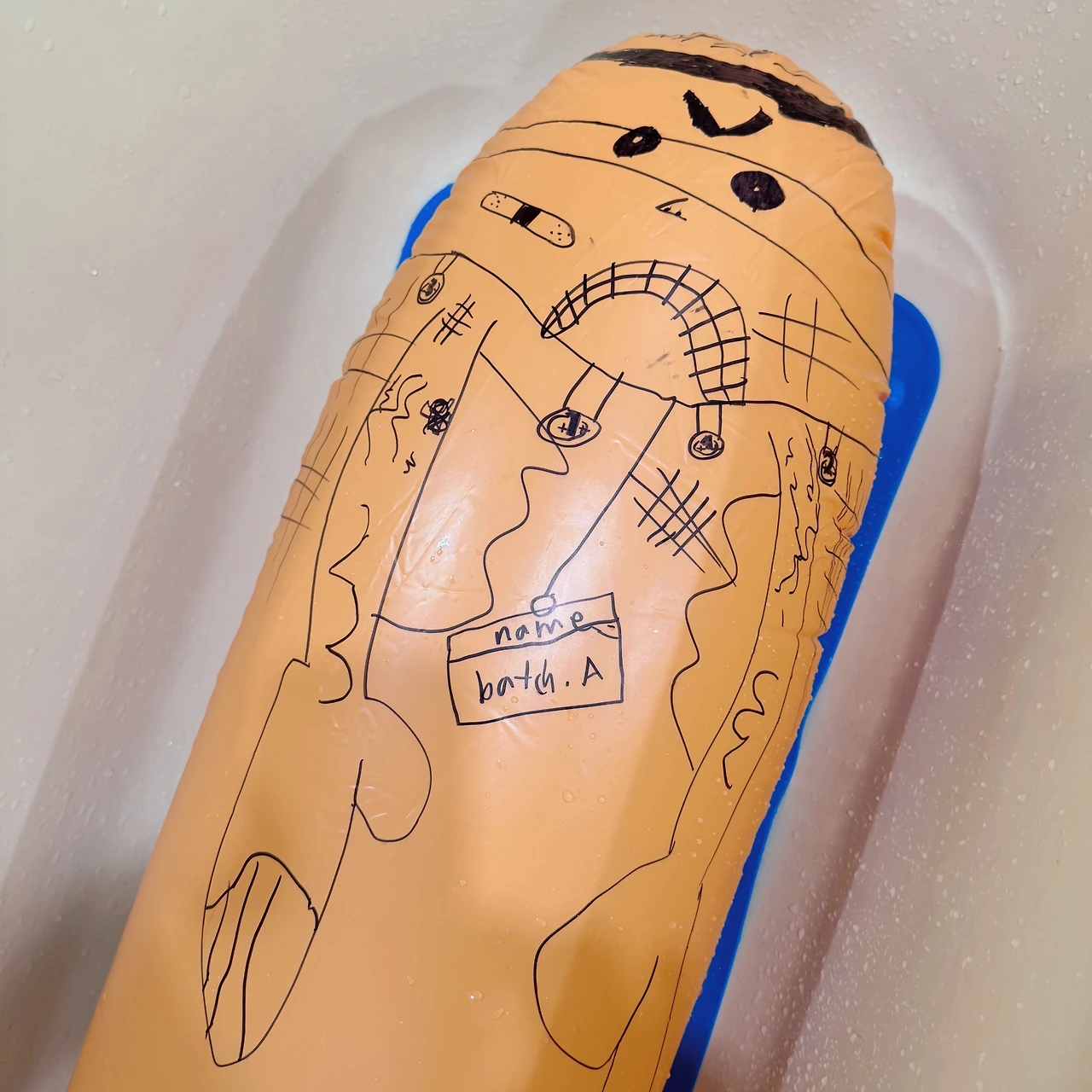 2호가 지쳐 나가떨어질 때쯤 지켜보고 있던 1호는 갑자기 매직을 들고 오더니 예술을 하기 시작했다. 펀칭백에게 얼굴과 몸을 그려주고 이름표도 달아주었다. 내 이름이 적혀 있지 않아 얼마나 다행이었는지 모른다.