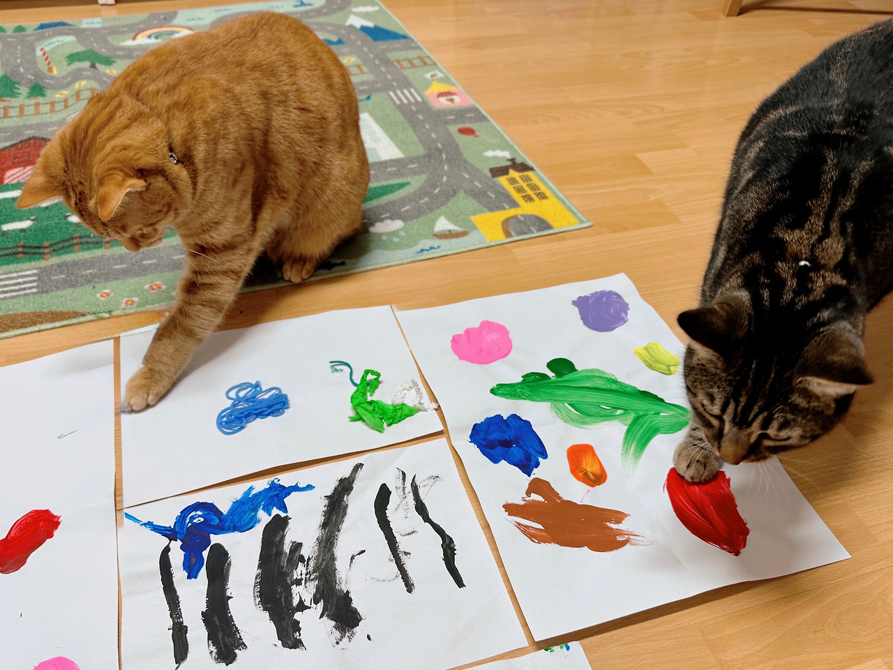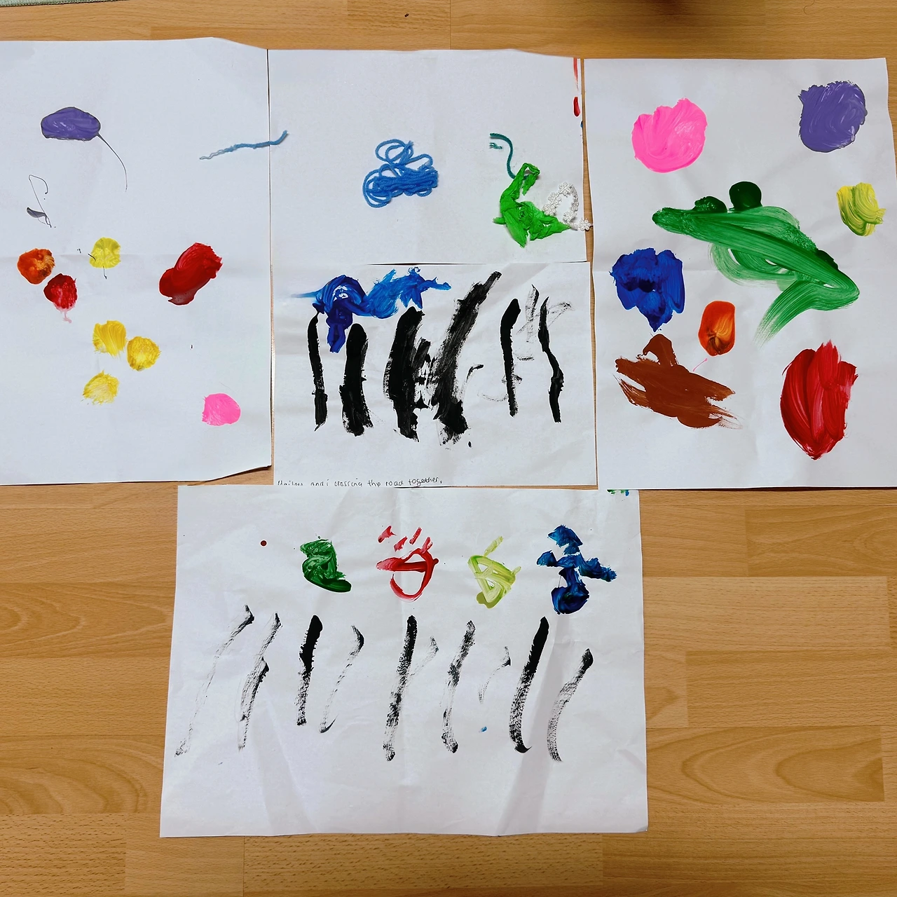 오늘 아침 이번 주 우리 예술가께서 만드신 작품을 바닥에 전시해 놓고 사진을 찍는데 작품 내용이 궁금한 건 나만이 아닌가 보다.