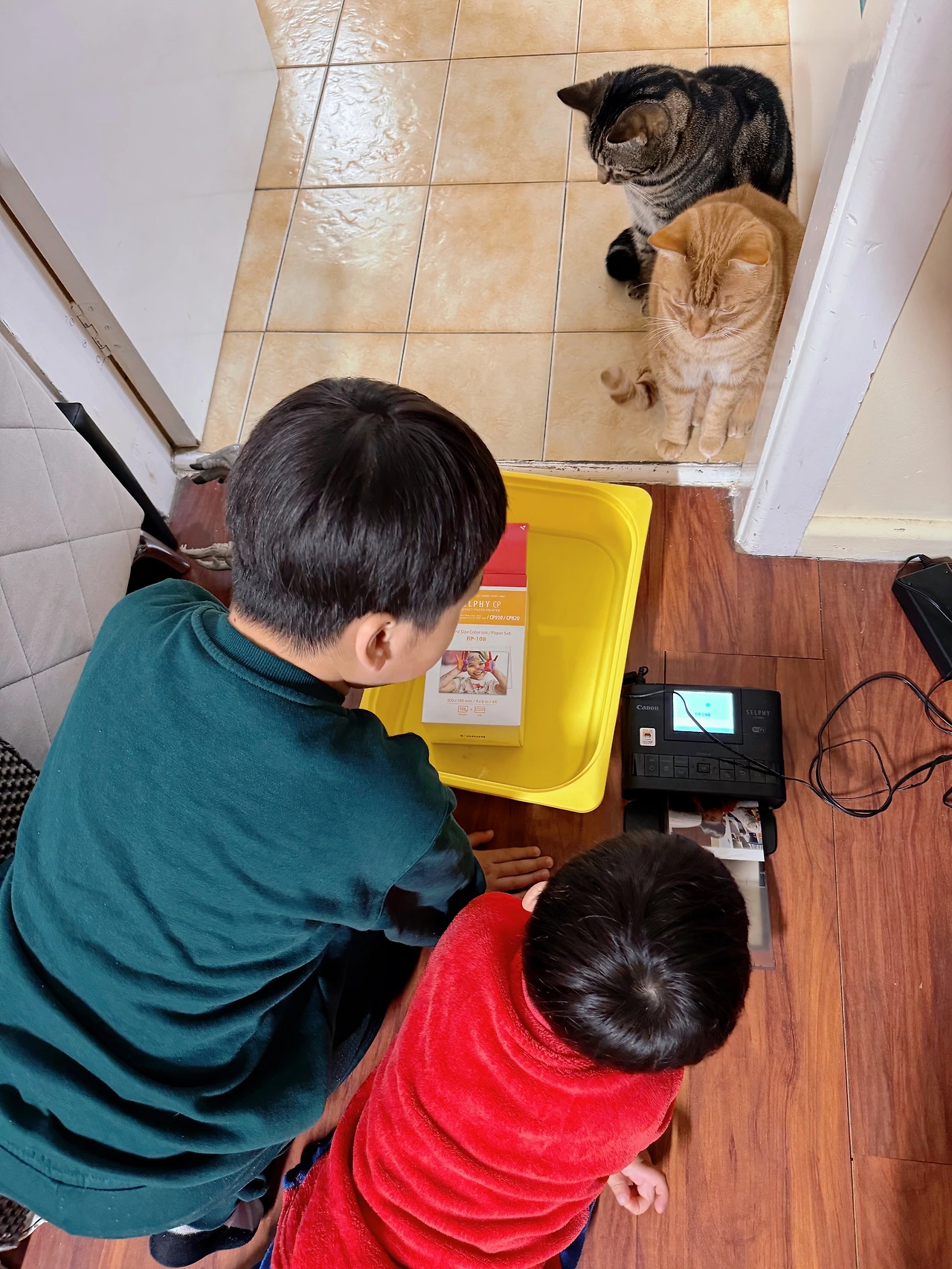 전원 연결할 곳이 마땅치 않아 놀이방 구석에 놓고 인화하고 있는데 한 녀석씩 슬금슬금 오더니 아이들 둘과 고양이 두 마리, 네 녀석 모두 옹기종기 모였다.
