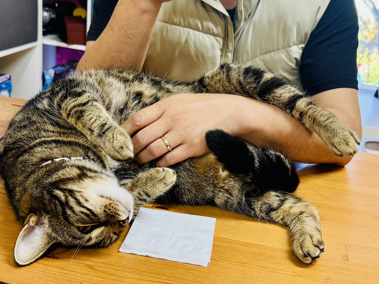 오늘은 남편이 걸려들었고, 남편의 손은 한동안 태비의 뱃살을 벗어나지 못했다.