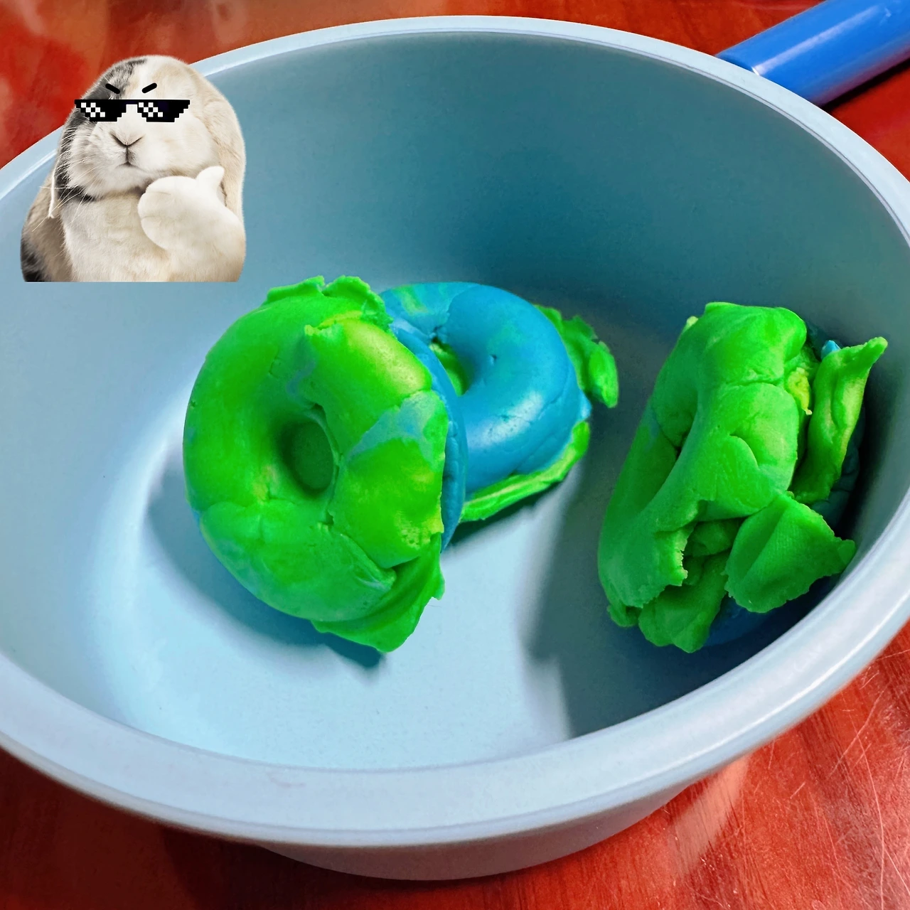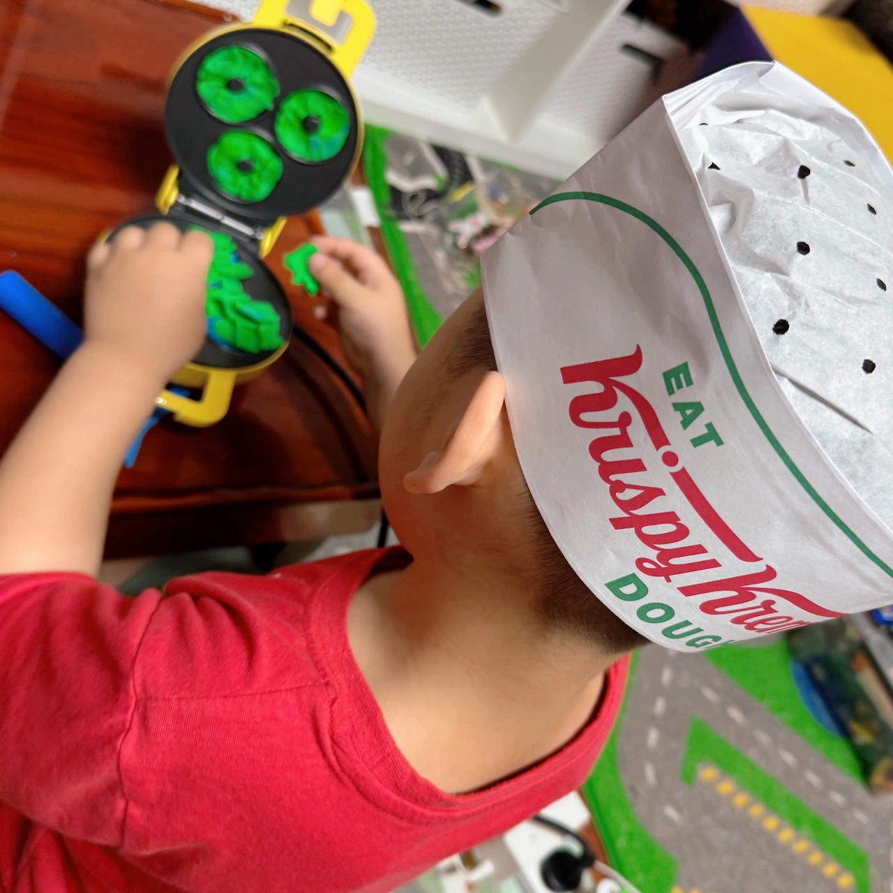 그러더니 오늘 저녁에 자기가 도넛을 만들어야 한다며 플레이 도우와 도넛 메이커를 꺼내 오더니 쉐프 모자를 챙겨 썼다. 아이는 순식간에 도넛 쉐프가 되어 세상 진지한 표정으로 도넛을 만들었다. 나름 모양도 예쁘게 구워낸 도우 도넛을 들고 얼마나 좋아하던지.