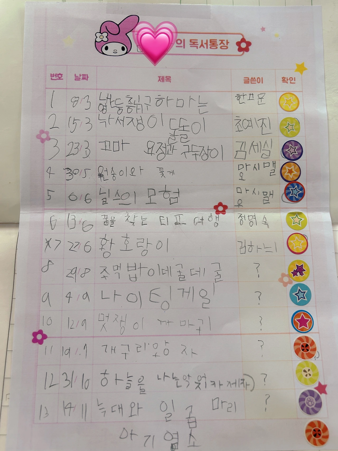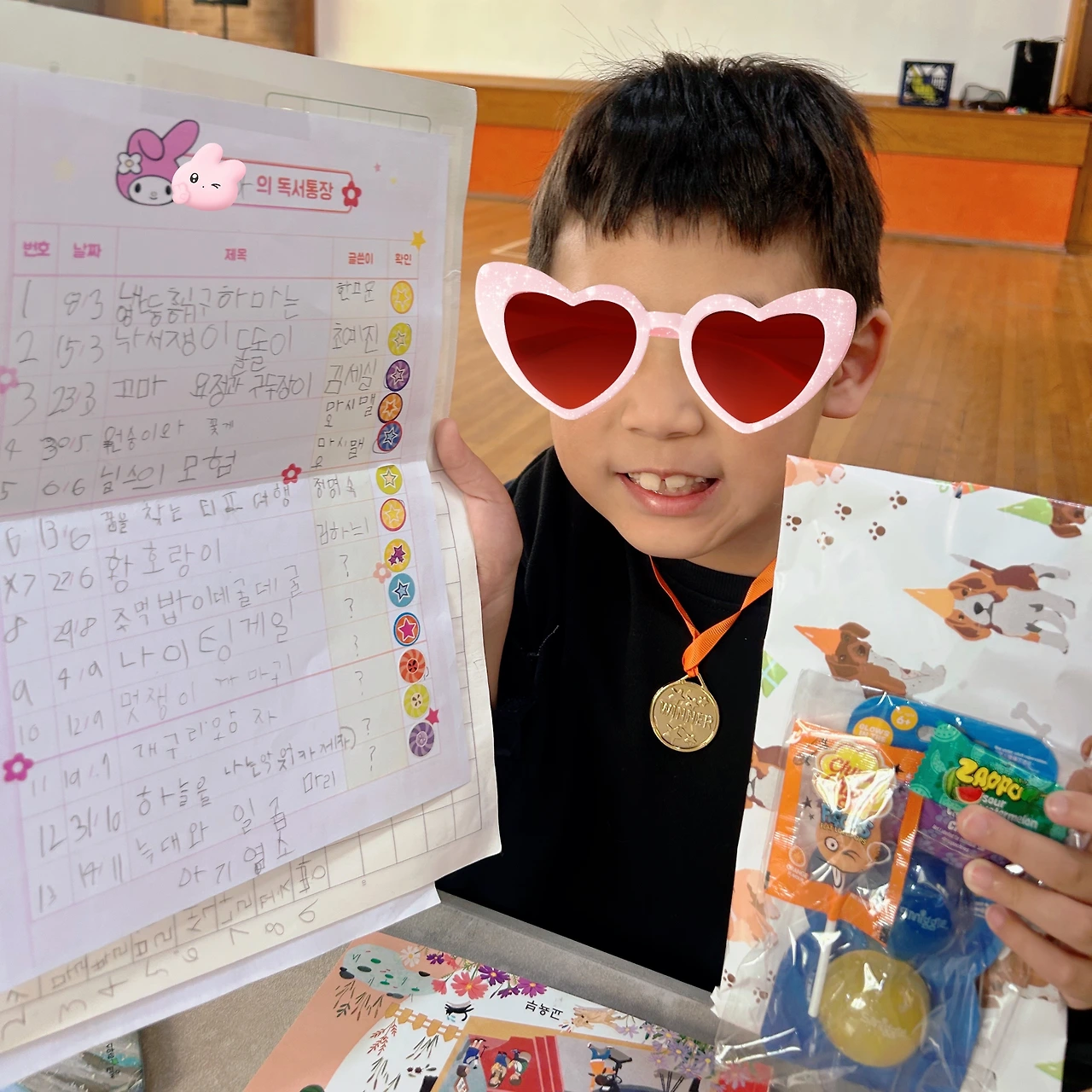 나는 1호가 뱃속에 있을 때부터 한글 동화책을 준비했는데 우리 집 아이들은 어쩜 하나 같이 책 읽기를 안 좋아하는지 정말 신기할 정도다. 이런 아이가 일주일에 한 권씩 동화책을 읽어오는 한글학교 숙제를 정말 성실히도 해냈다. 물론 엄마의 잔소리와 아빠의 읽기 보조라는 큰 도움이 있었지만 그래도 빠지지 않고 꾸준히 했다는 것에 나는 박수를 친다. 매주 아이들을 가르치시느라 고생하시는 한글학교 선생님도 우리 1호가 얼마나 귀찮음을 이겨내고 열심히 해냈는지 독서 통장을 통해서 알아채고 응원해 주셨다.