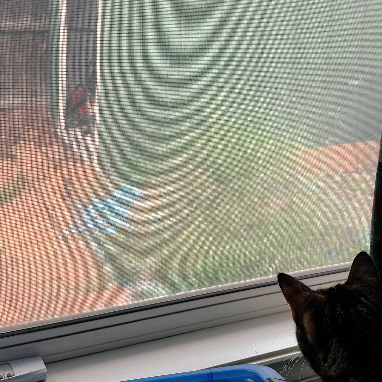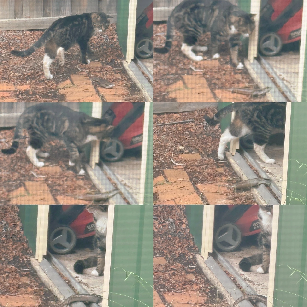 사진에 찍힌 녀석에게 우리 집 뒷마당은 자기 영역인가 보다. 똥도 싸고, 토악질도 하고, 그루밍도 하고 낮잠도 잔다. 그러다 심심하면 잔디깎이 등이 들어 있는 가라지로 가서 이 벌레 저 벌레 가지고 논다. 그럴 때마다 우리 집에 있는 치즈와 태비는 이방 저 방 창문을 왔다 갔다 하며 경계한다. 뭐, 밖에 있는 녀석은 신경도 안 쓰는 듯 하지만.