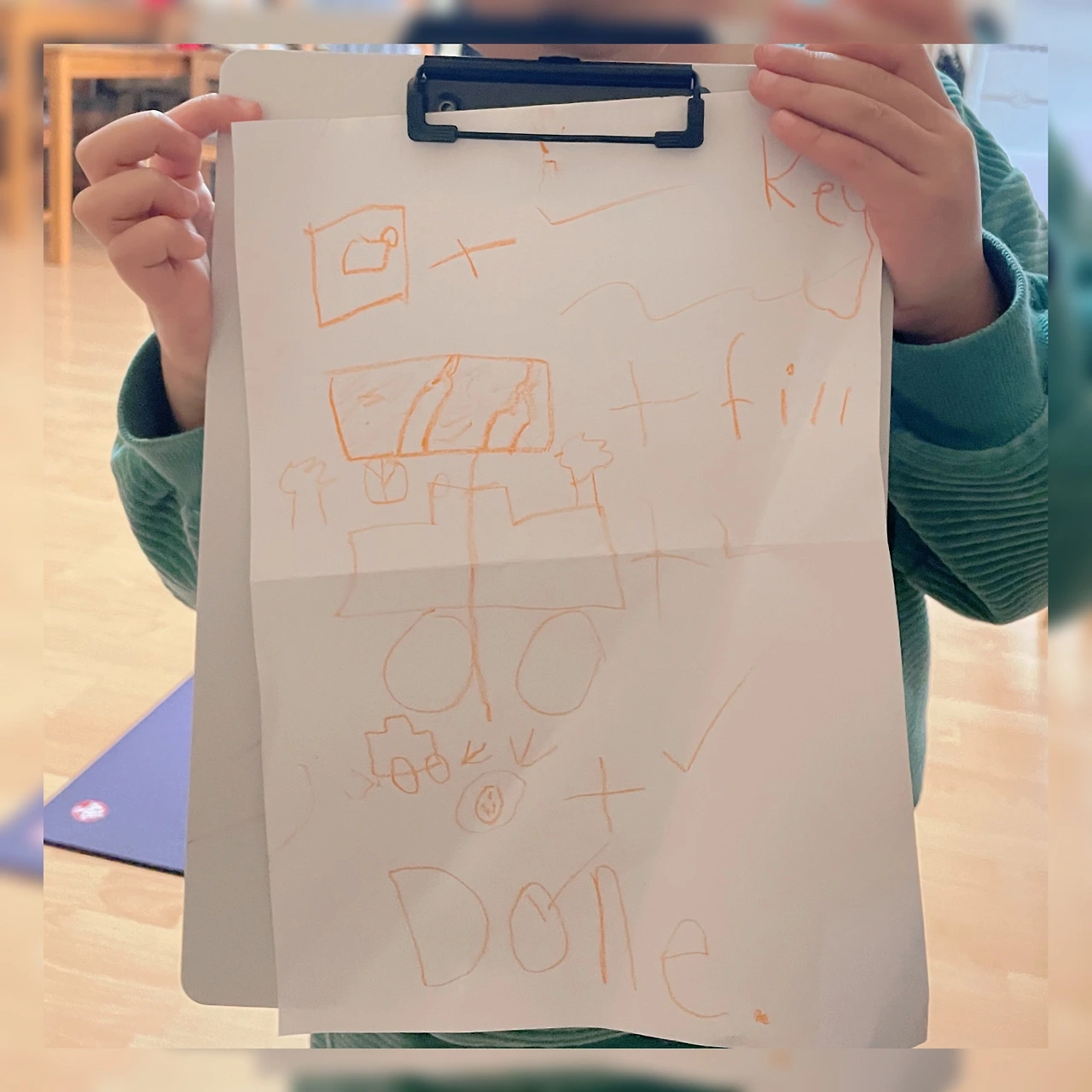 궁금한 마음에 요리가 거의 마무리되어갈 즈음 아이를 불렀다. 10분 뒤면 나갈 수 있는데 괜찮겠냐고 물으며 아이를 찾아보았다. 이때 ‘짜잔~’하는 소리와 함께 아이가 내 눈앞에 종이 한 장을 내밀었다.