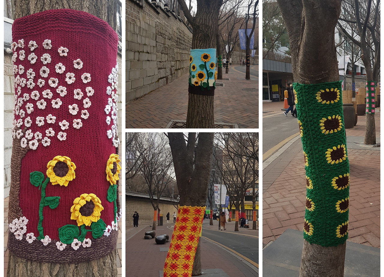 예쁜 옷을 입고 있는 가로수들이 눈에 띄네요. 한 폭의 그림을 연상시키듯 알록달록 옷을 입었습니다. 나무 몸통을 다 두른 뜨개옷이 예사롭지 않았어요.