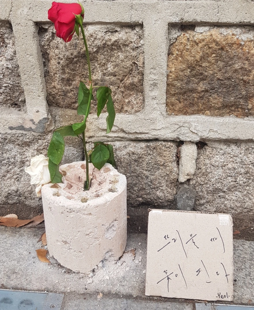 덕수궁 돌담길 (이효열 작가 작품)무심코 오른쪽을 보니 연타재가 놓여 있었어요. 관광객도 많은데 누가 여기에 이런걸 나뒀지라는 생각이 들던 찰나. 연탄재에 꽂혀있는 장미 한 송이가 시선을 붙잡습니다.