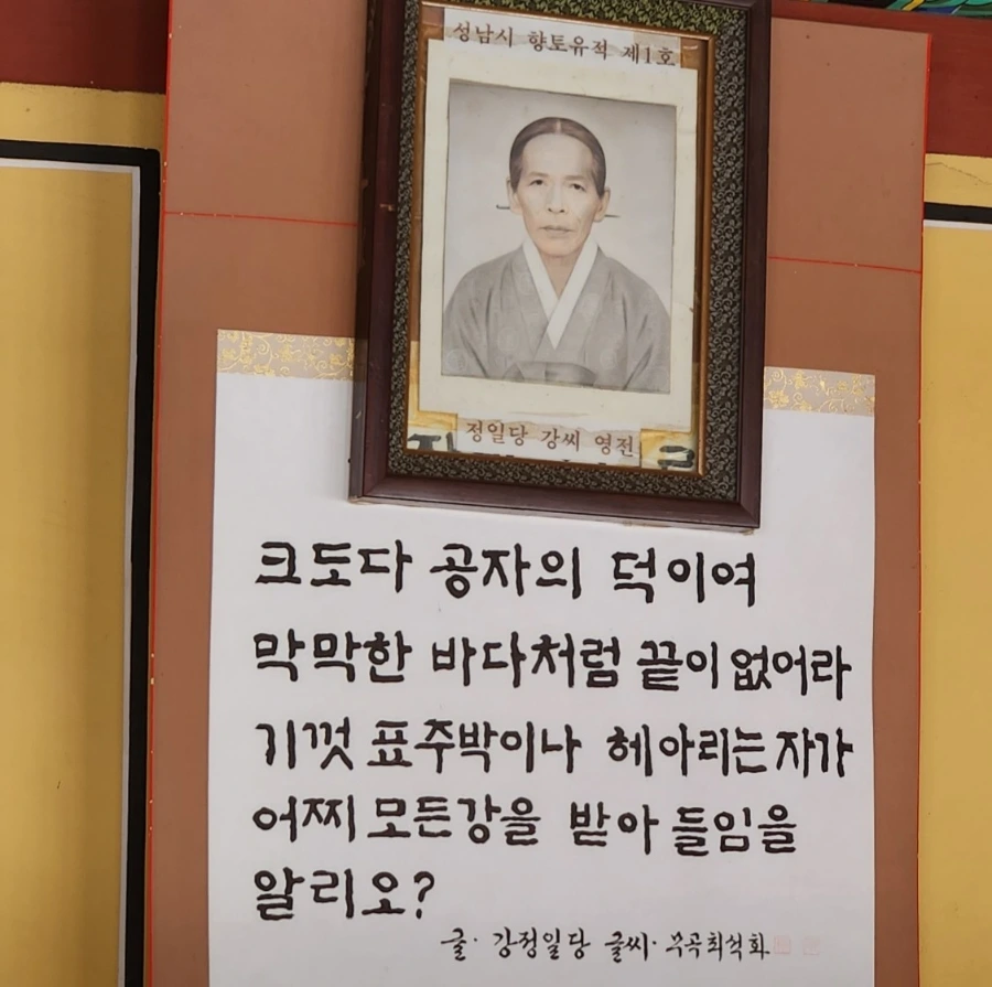 인근에 공사장이 있어 비포장도로 구간이 길었다. 약간의 오르막길을 지나 도착했는데 아쉽게도 정일당 강씨 사당 문은 잠겨있었다. 精一堂 세 글자가 적힌 현판을 바라보는 것으로 아쉬움을 달래야 했다. 그런데 호기심 많은 누군가에 의해 이미 손가락 구멍이 뚫린 상태였다. 구멍 속으로 빼꼼히 들여다보니 위패와 정일당 사진이 있었다. 단정하고 강직한 모습이었다.