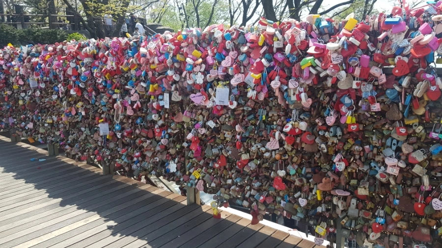 연인들의 정표로 가득한 알록달록 자물쇠가 꽃보다 화려합니다. 꽃보다 뜨거웠을 사랑의 서약이 또 다른 사랑으로 덧칠해지는 곳. 켜켜이 쌓인 자물쇠에 방울방울 사연이 아로새겨져 있는 듯 합니다.