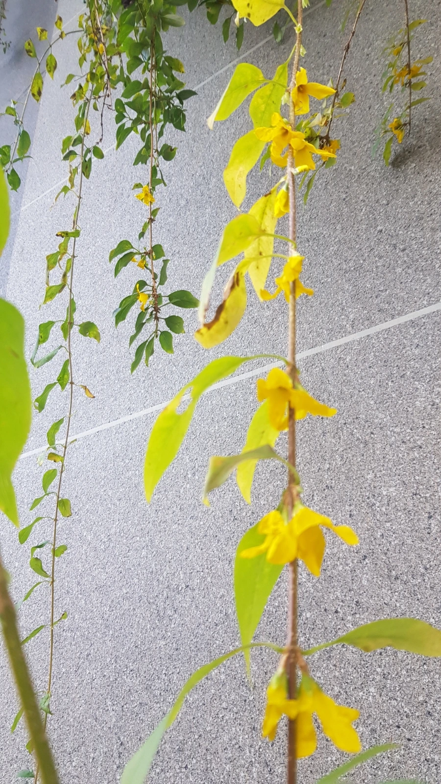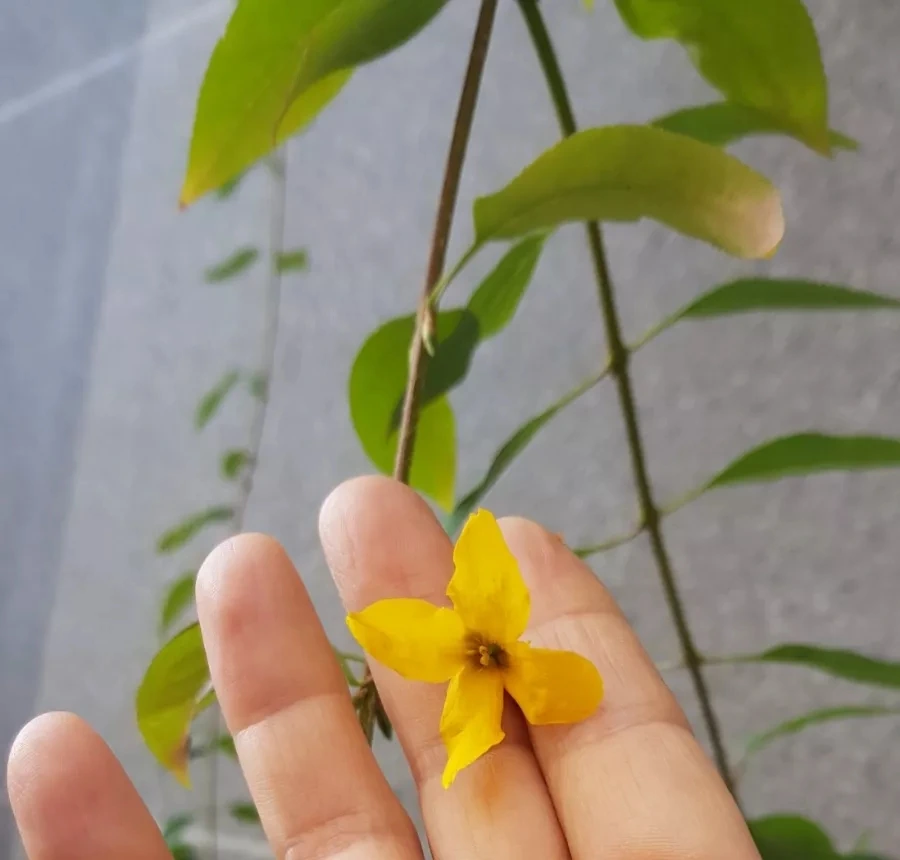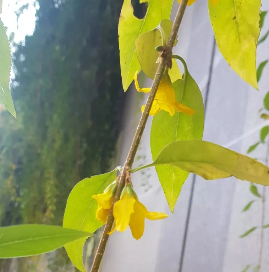 걷다 보니 산 쪽으로 향하는 등산로 담장쪽 개나리가 눈에 띈다. cctv 화면을 가렸던 그 위치다. 기다란 줄기들을 들춰보았다. 가지 하나가 웃자라 길다랗게 뻗어 있다. 잡아당겨보았다. 의외로 질기다. 이리저리 흔들어보니 노란 빛깔이 햇빛을 받아 곱게 빛난다. 초록색 잎사귀에 노랗게 변해가는 잎이려니 했다. 단풍이 들었구나 정도. 그런데 가지에 달라 붙은 모양새가 다르다. 이런 개나리꽃이다. 지난 3월에 만났던 개나리다.