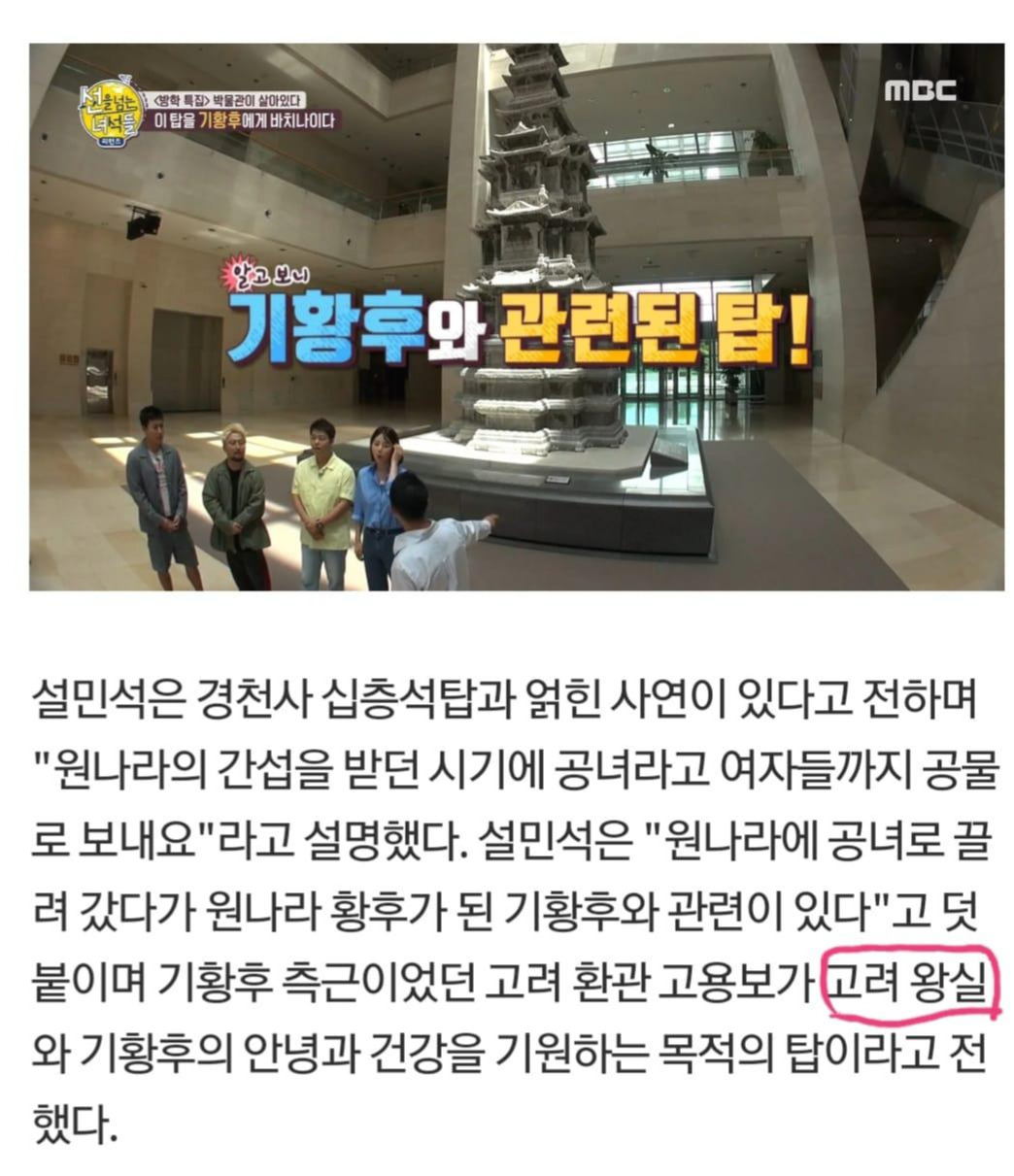 그러나 지난 8월 MBC <선을 넘는 녀석들>에서 경천사 십층 석탑에 대해 또 다르게 설명했다. 이날 방송은 국립중앙박물관의 몇 가지 유물을 설명했는데 그중 경천사 십층 석탑을 소개하며 이 탑이 기황후와 관련된 탑이라는 걸 강조했다. 물론 탑에는 원나라 황제와 황후, 황태자를 위해 지었다고 쓰여있고 여기에서 황후는 기황후를 지칭한다. 고려 여자로 세계제국 원나라의 황후가 되었으니 기황후를 위해 세운 경천사탑은 그만한 역사적 가치를 갖고 있음을 강조한 것으로 보인다.