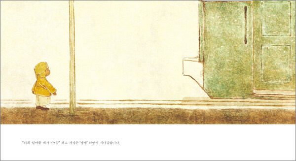 엄마를 전차 정류장에서 기다리는 아이. 작가는 엄마를 기다리는 아이의 간절함을 색깔의 대비로 표현한다. 화사하게 그려낸 전차 속 아이는 바람이 불어도 전차가 와도 더이상 차장에게 묻지 않고, 코만 새빨개져서 그냥 자리에서 서있기만 한다. 마지막 연둣빛으로 그려낸 엄마를 만나 함께 걸어가는 장면은 아이의 세상과는 다른 세계로 그려진다. 아마도 작가의 바램이 들어간 장면인것 같다.