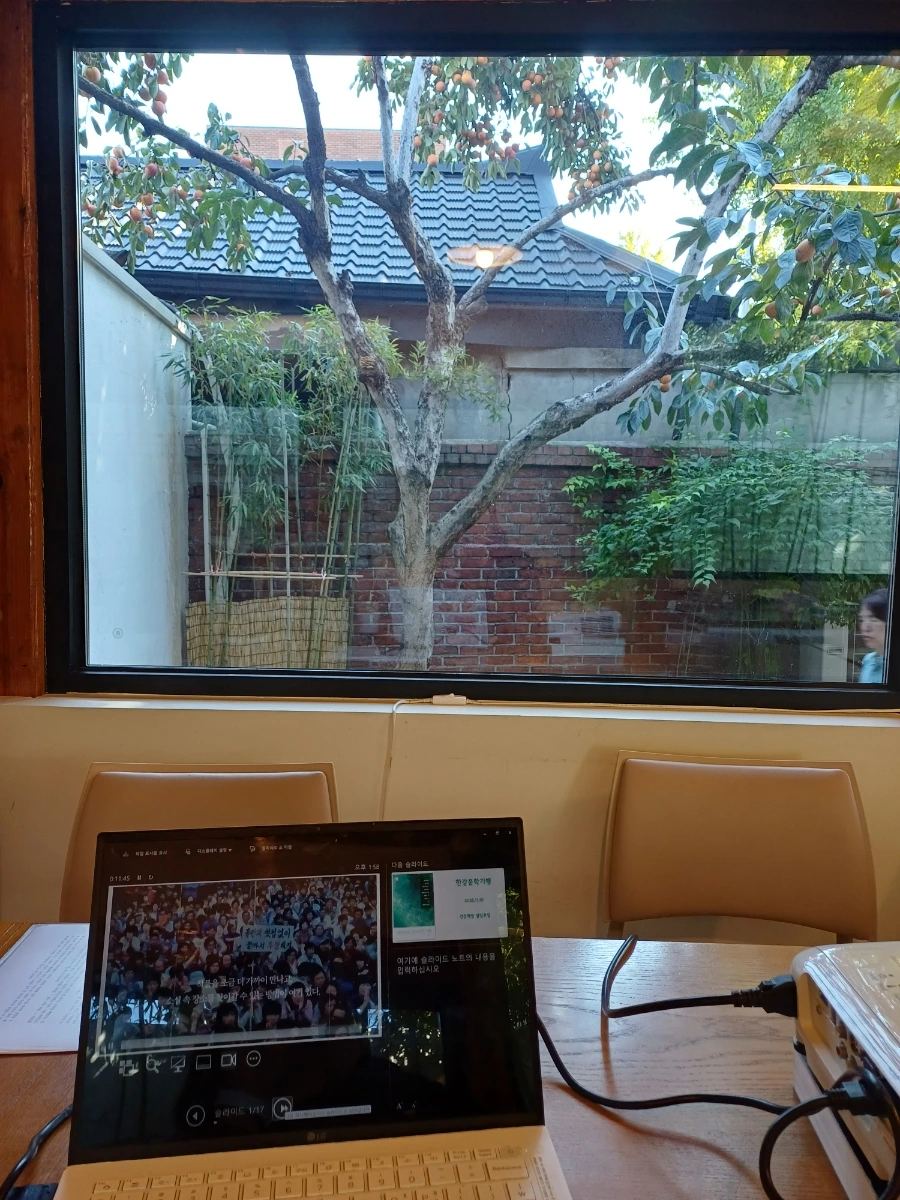 북토크 날 빔프젝트를 가운데 두고 바깥 통창에 걸려있는 감나무 한그루가 눈에 밟혔다. 한강의 이야기를 나누고 북토크를 하는 이 바쁜 와중에 나는 그 감나무가 마음에 남았다. 고목져있는 열매를 따줘서 그 나무를 쉬게 해 주고 싶었다. 통창에 걸린 그 감나무는 이 책방에 상징일까. 별의 별 생각으로 북토크에 필요한 일들을 지원했다. 감나무가 영글어 걸릴때까지 얼마나 힘을 썼을꼬.
