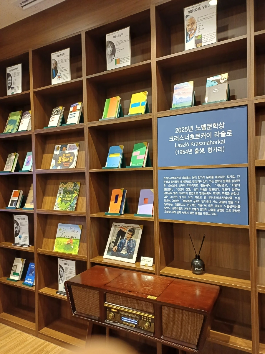 올해 노벨문학상 수상자인 크러스너호르커이 라슬로(1954년 헝가리 출생)의 책도 전시되어 있었다.아래 오래된 음향기기는 가동이 되는지 모르겠지만, 다 버려도 가져오고 싶을 만큼 탐이 났다. 나만의 공간에 하나쯤은 있을 법한 기기다. <사탄탱고>를 시작으로 <저항의 멜랑콜리>, <전쟁과 전쟁>등의 작품을 발표했다고 소개하며, 2015년 헝가리 작가 최초로 맨 부커인터내셔널상을 수상했다는 걸 알게 되었다. 그 다음해에 한강이 2016년 <채식주의자>로 같은 상을 수상한다. 노벨문학상을 받은것과 동시에 맨 부커상도 수상한 두 작가. 연속된 해에 동유럽과 아시아에서 비영어권문학 작가가 수상을 받은건 의미가 크다. 아직 <사탄탱고>를 읽지 못했지만, 한강의 깨끗하고 시적인 여백의 느낌과 달리 라슬로의 책은 긴 문장하나가 여러페이지로 이어지는 문체를 지니어 읽는 이를 혼란에 빠트린다고 한다. "종말론적 공포의 한가운데 서도 예술의 힘을 다시 일깨우는 강렬하고도 선구적인 작품"으로 노벨위원회에서 평했다.