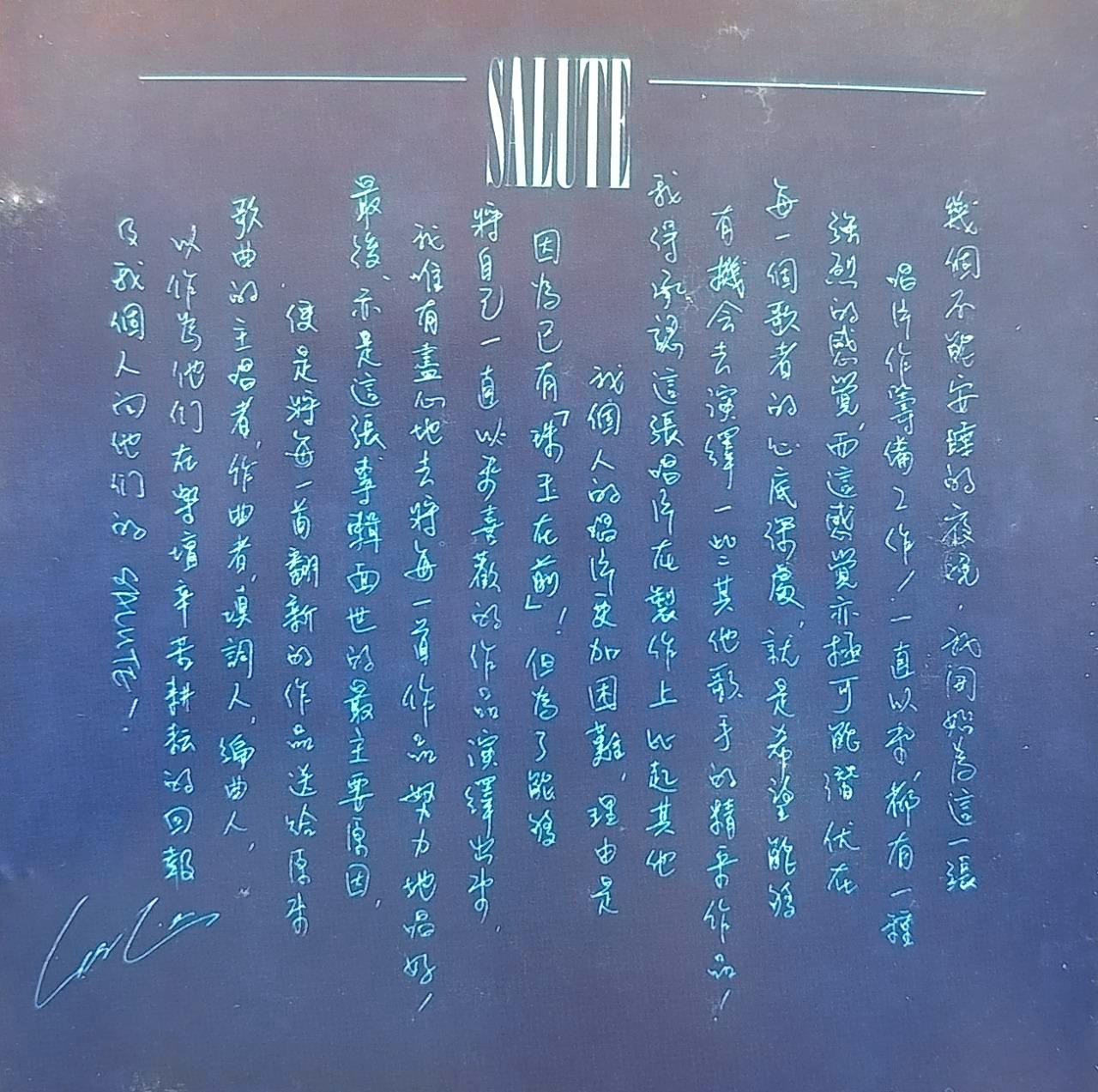 오늘은 80년대 말에 발표한 작품 중에서 매우 특별한 앨범을 하나 소개하려고 한다. 바로 <Salute>다. 가수 은퇴발표를 한 달 앞둔 1989년 8월에 발표한 스무 번째 광동어 레코딩 앨범인데, '경의' 내지는 '존경'을 뜻하는 앨범 제목에서 짐작할 수 있듯, 리메이크 앨범이다.
