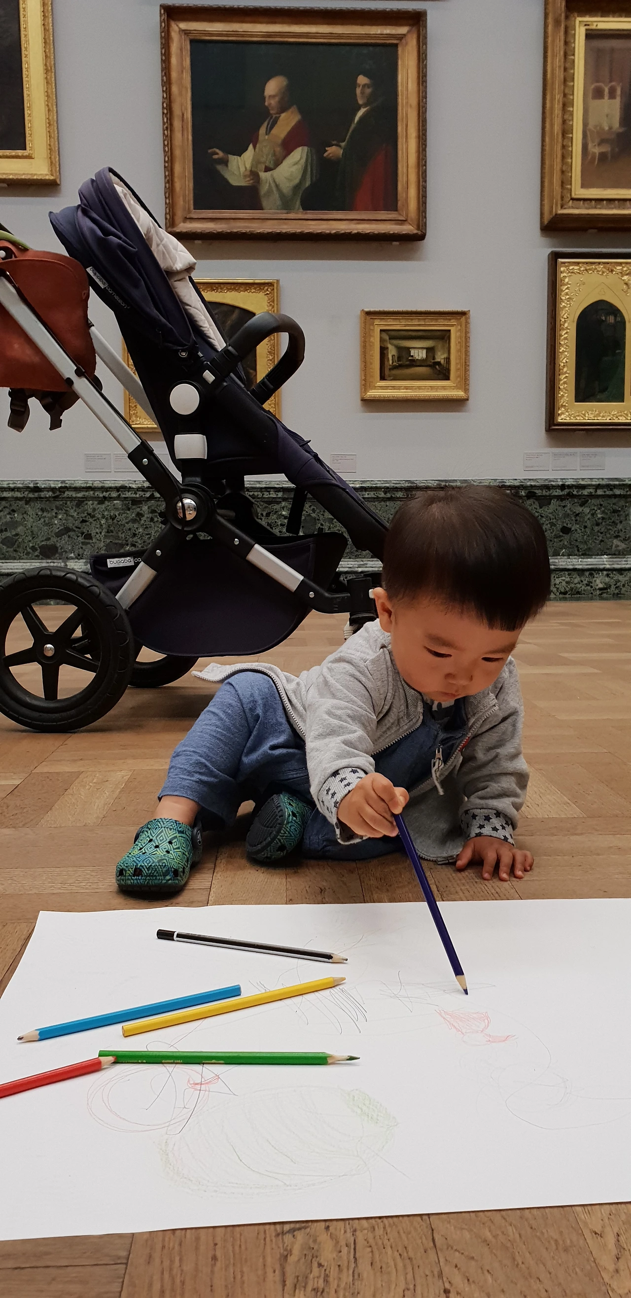 런던에 있는 웬만한 미술관 박물관은 아이와 함께 다 가 본 것 같아요. 혼자 다니던 것과는 너무 달랐죠. 아무렇지 않게 타던 에스컬레이터, 걸어 오르던 계단을 유모차를 가지고 이용할 수는 없었어요. 유모차 2대가 들어가면 꽉 차는 작은 엘리베이터는 타이밍이 잘못 맞추면 한참이고 기다려야 해요. 협소한 기저귀 갈이대, 너무 멀리 위치한 어린이 화장실, 수유실 등 배려를 덜 받고 있다고 느껴질 때면 나도 모르게 불평이 터져 나왔어요. 아이가 놀기에 위험하지는 않은지, 자유롭게 뛰어놀 수 있는 공간이 있는지 이런저런 것들을 고려하다 보니 미술관을 평가하는 척도도, 좋아하고 자주 가게 되는 미술관도 많이 바뀌었어요.