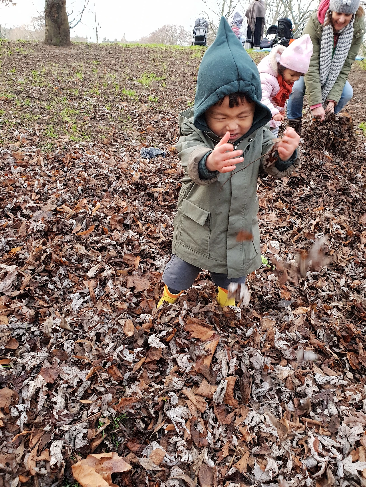 한국에서 30여 년을 배우고 자랐으니 영국에서 체감한 육아와 교육방식은 너무나 달랐어요. 부모의 성향마다 아이의 성향마다 모든 게 천차만별이겠지만요. 영국은 아이들을 자유롭게? 키운다 생각했어요. 이제 막 기기 시작한 아기들이 더러운 카펫 위를 기어 다니며 놀아요. 공원이나 놀이터에서 아이들은 신발을 벗고 뛰어놀아요. 잔디와 모래를 씹고 뜯고 맛보고 즐기죠. 나무를 타고 올라가고 잔디에서 뒹굴뒹굴해요. 아이를 키우기 전에는 사실 다른 아이들이 어떻게 노는지 유심히 지켜보질 않았어요. 내가 그 상황에 닥치다 보니 유심히 보게 되었죠. 모든 상황을 아무렇지 않은 척 웃으며 지켜봤지만 사실은 조금 충격이었어요. 마치 무균실 마냥 아기 입에 들어가는 모든 것을 삶고 소독하고, 보이지 않는 균이 하나라도 입에 들어갈까 노심초사하며 집에 있는 장난감을 닦고 또 닦던 저였으니까요. 그런데 어느 순간 모든 것을 체념하게 되더라고요. 적응하게 된 걸까요? 모래밭에 파묻혀 모래 샤워를 해도 눈을 질끈 감아요. 마음을 고쳐먹고 나니 세상은 아이가 물고 빨고 탐험할 것투성이 더라고요. 땅을 파고, 낙엽을 줍고, 나무를 타고, 벌레를 잡고 손을 툭툭 털고 간식을 먹어요. 사실 어릴 적 나의 놀이와 닮아있었어요.