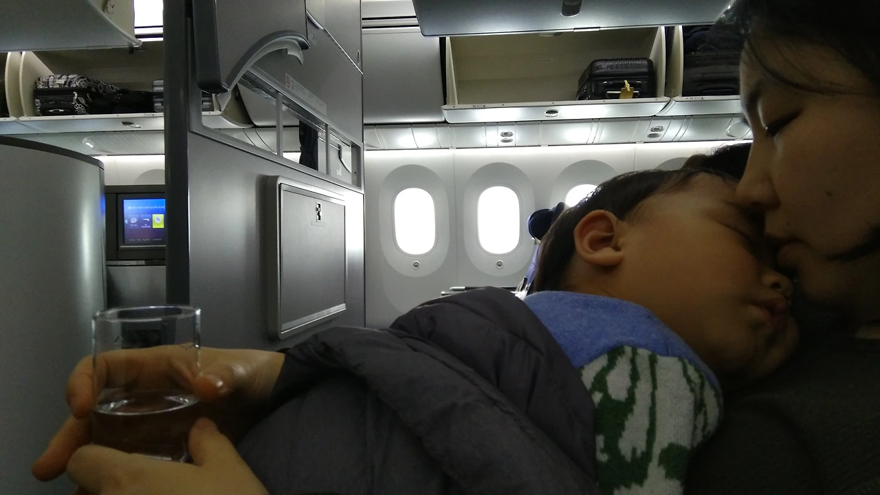 문제는 영국으로 돌아오는 비행이었어요. 아침 10시에 한국에서 출발하는 비행기를 탔습니다. 한창 먹고 놀 시간에 비행기를 타니 아이를 좌석에 머물게 하는 건 여간 어려운 일이 아니었어요. 어떤 간식도 장난감도 통하지 않았죠. 비행시간은 엄마인 저에게 너무도 길었습니다. 이제 막 걸음마를 떼고 세상 구경을 시작한 아이에게 비행기는 얼마나 재미있겠어요. 비행기 실내를 이렇게 샅샅이 둘러보긴 또 처음이었어요. 아이와 둘만의 비행이라 일부러 좋은 좌석을 예매했지만 엉덩이를 붙이고 있을 수 없었죠.