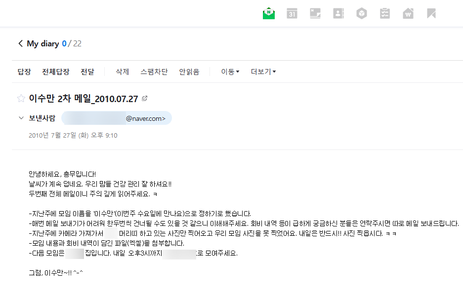 최근에 문득 기억이 나서 메일함을 열어 보았다. '한솔 맘 모임 1차' 공지 메일과, '이수만'이라는 이름을 확정 짓고 주고받은 2차 모임 안내 메일이 그대로 남아 있었다. 그 메일 속에는, 그 시절 우리의 온기가 고스란히 담겨 있었다. 읽는 내내 웃음이 번졌다. '이번 주 수요일에 만나요.' 그 짧은 인사가 얼마나 큰 위로와 설렘이었는지 새삼 깨달았다.