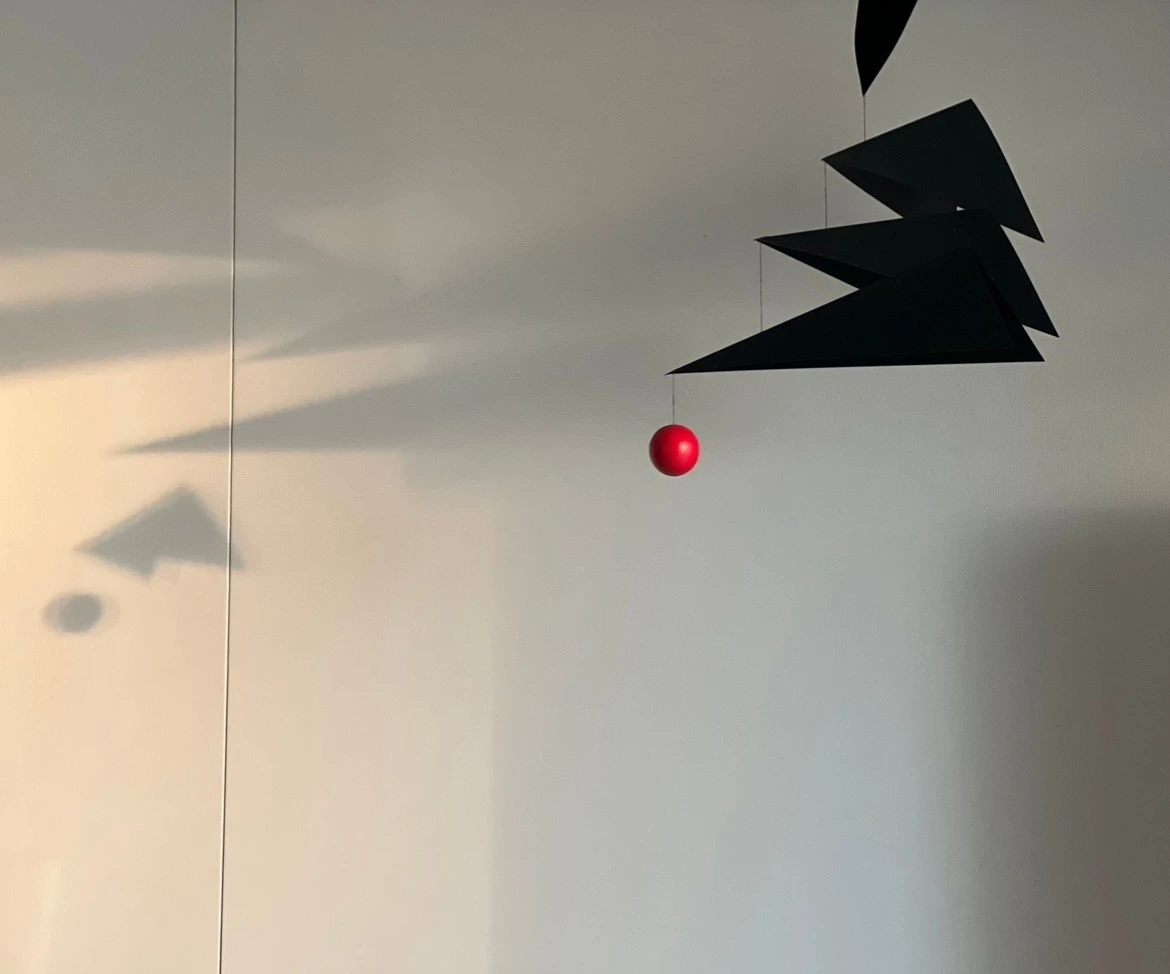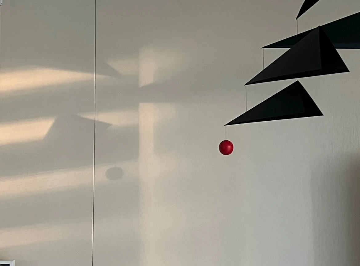 어쩌면 정제된 형태와 단순한 선들이 과하지 않으니 여백이 살아 있고, 그 여백을 채우는 것은 빛, 그림자, 그리고 나의 마음이다. 오늘 모빌은 아주 사소한 움직임으로도 빛과 어우러져 긴 여운을 남겼다. 작은 모빌 날개가 공기를 가르며 드리운 그림자는 잠시 동안 거실을 새로운 차원으로 바꾸어 놓았다. 시간이 흐르며 해는 서서히 저물고, 모빌의 그림자는 점점 희미해졌다. 처음에는 또렷하던 윤곽이 서서히 풀리더니, 어느 순간에는 빛과 하나가 되어 사라졌다. 그러나 내 마음속에는 그 장면이 오래 남았다. 사라지는 것 같지만 사라지지 않는 것, 눈에 보이지 않아도 마음에 각인되는 것, 그것이 우리가 붙잡아야 할 아름다움이 아닐까.