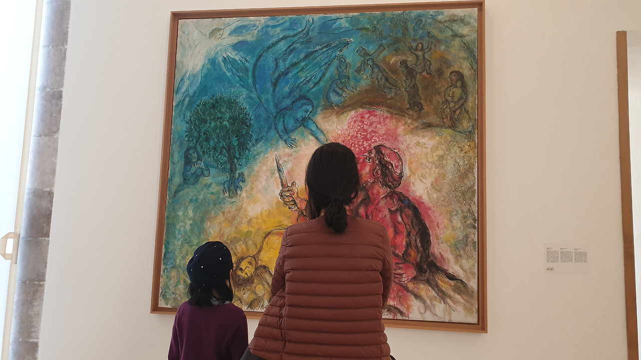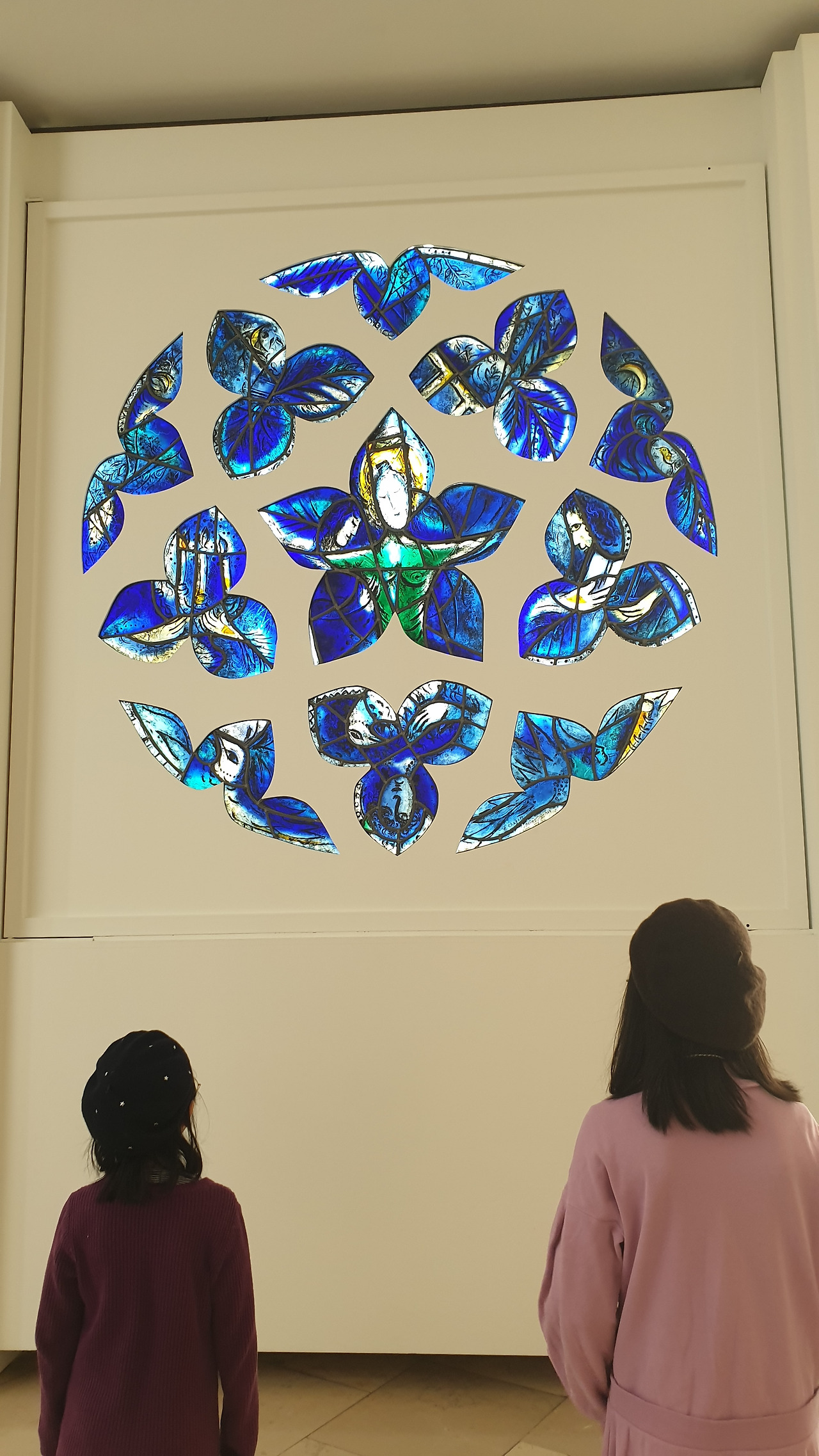 사실 나는 샤갈 미술관을 가기 전부터 치밀하게 아이들의 옷을 샤갈의 임팩트 있는 색상으로 깔맞춤 해서 입혀가는 센스를 발휘하기도 했는데, 아니나 다를까 샤걀의 살아 숨 쉬는 듯한 마법의 색상들은 아이들을 상상의 나래로 몰입시키기 충분했다.