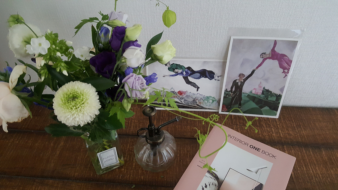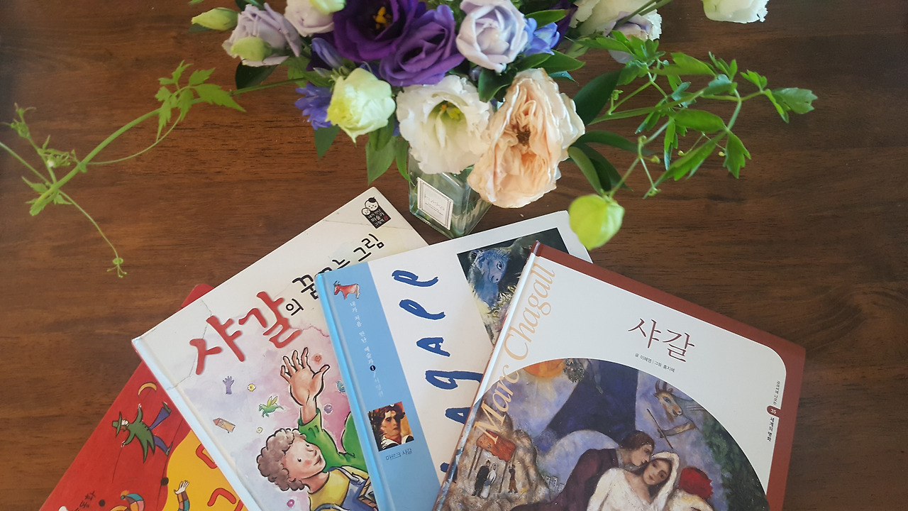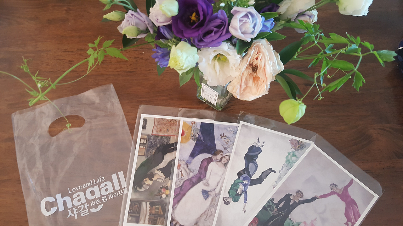샤갈전에서 사 온 기념엽서들은 진보라, 진초록 등의 임팩트 있는 색감이었고, 아이들과 함께 샤갈 하면 떠오르는 색상에 대해 꽃과 연결하여 융합적인 사고로 미술관 관람 후 집에서 다시 한번 감상했었던 것으로 기억된다.