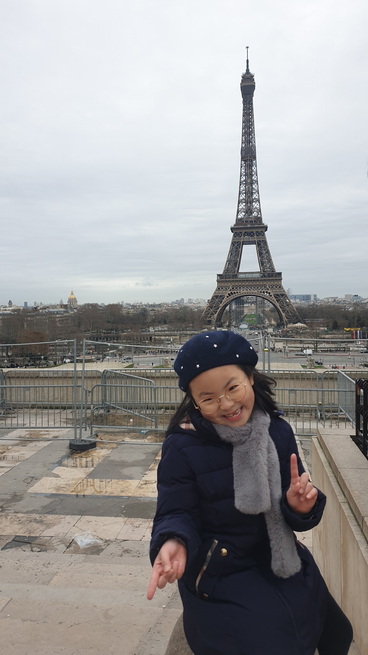 사요 궁전 앞에서 버스킹 음악 가락에 맞춰 즐거워하는 둘째 아이의 뒤로 운치 있는 에펠탑이 서 있고 흐린 날씨가 한몫하여 파리는 더욱 낭만의 멋이 짙어진다.
