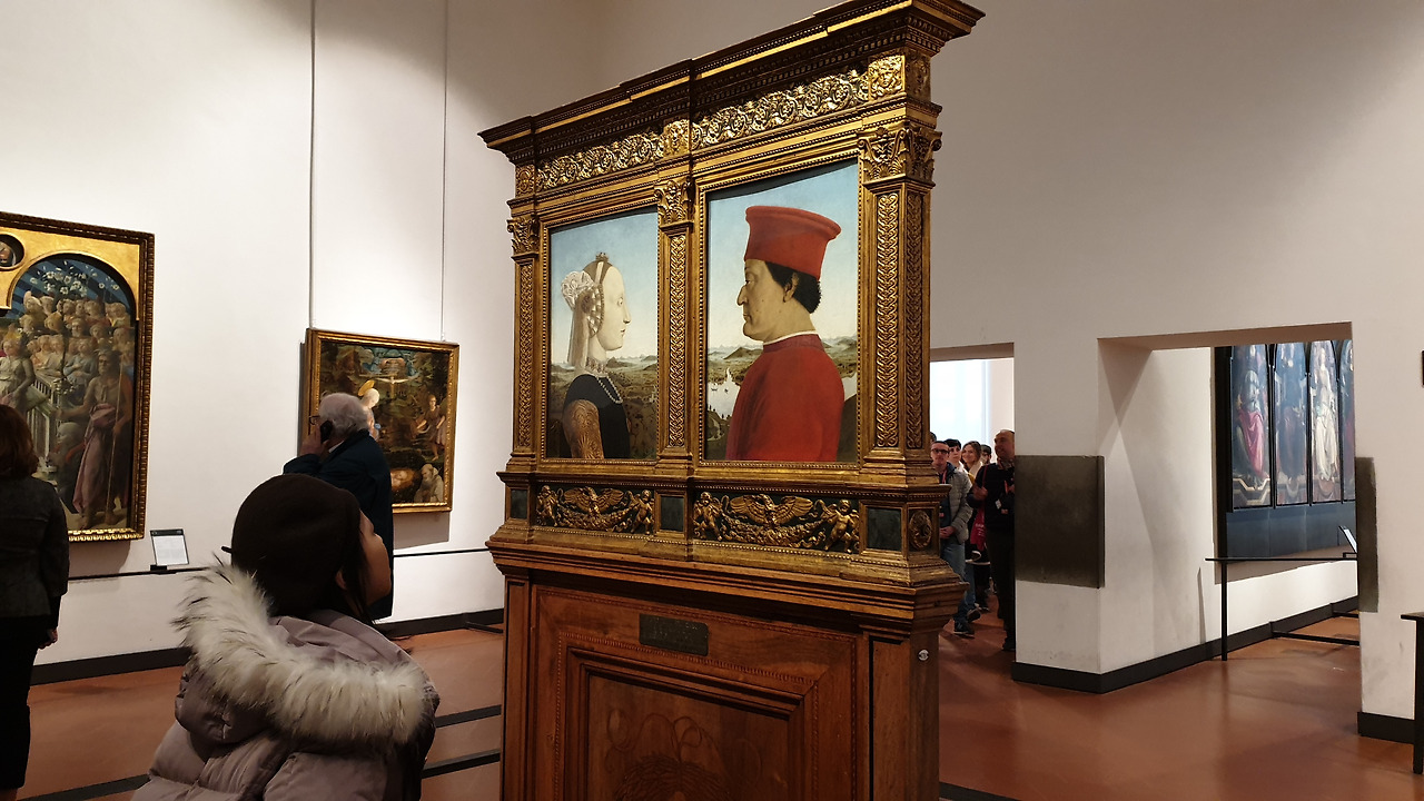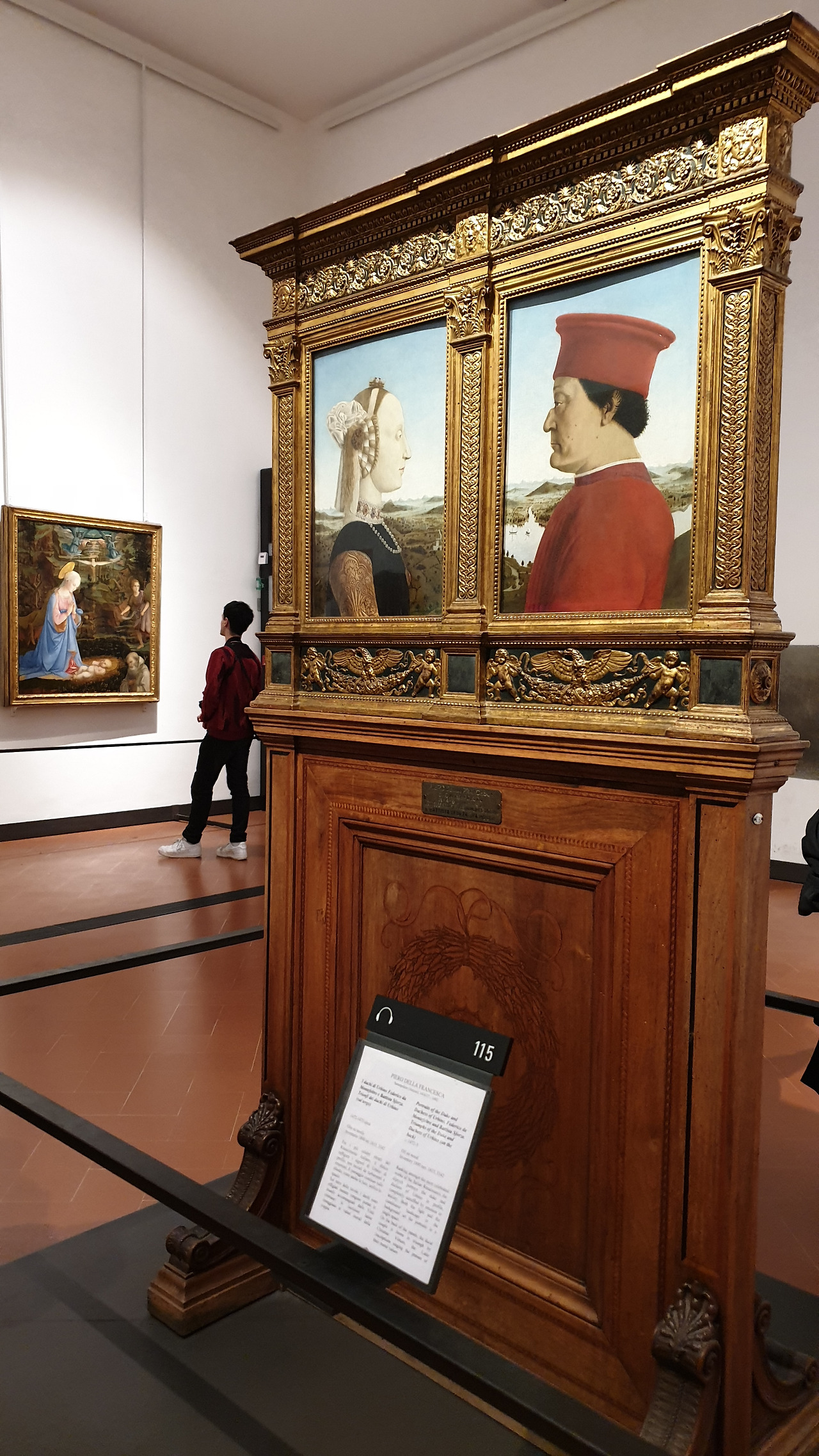 우르비노의 공작 부부의 옆모습을 그린 작품인 <우르비노의 초상화>는 24살 차이가 나는 부부가 11년간의 결혼 생활 중 7명의 자녀를 낳을 정도로 사랑하는 사이였으나 작가가 작품을 하는 사이에 부인이 사망하여 시신을 덮은 마스크를 보고 그림을 그렸다는 이야기를 알고 나니 부부의 애절한 영혼이 마주 볼 수 있도록 배치한 것 같아 마음이 시린 작품이었다.
