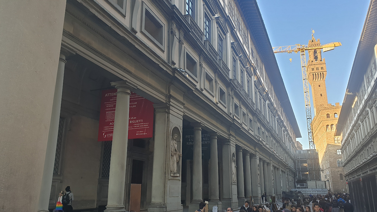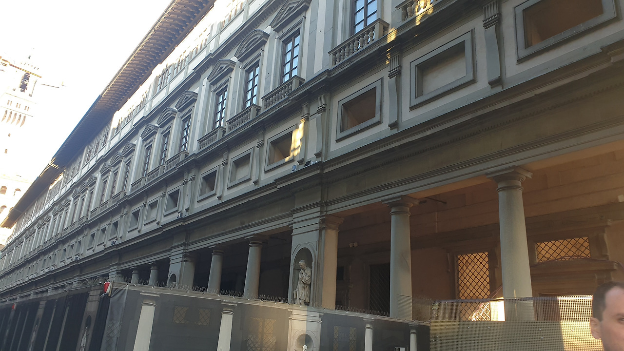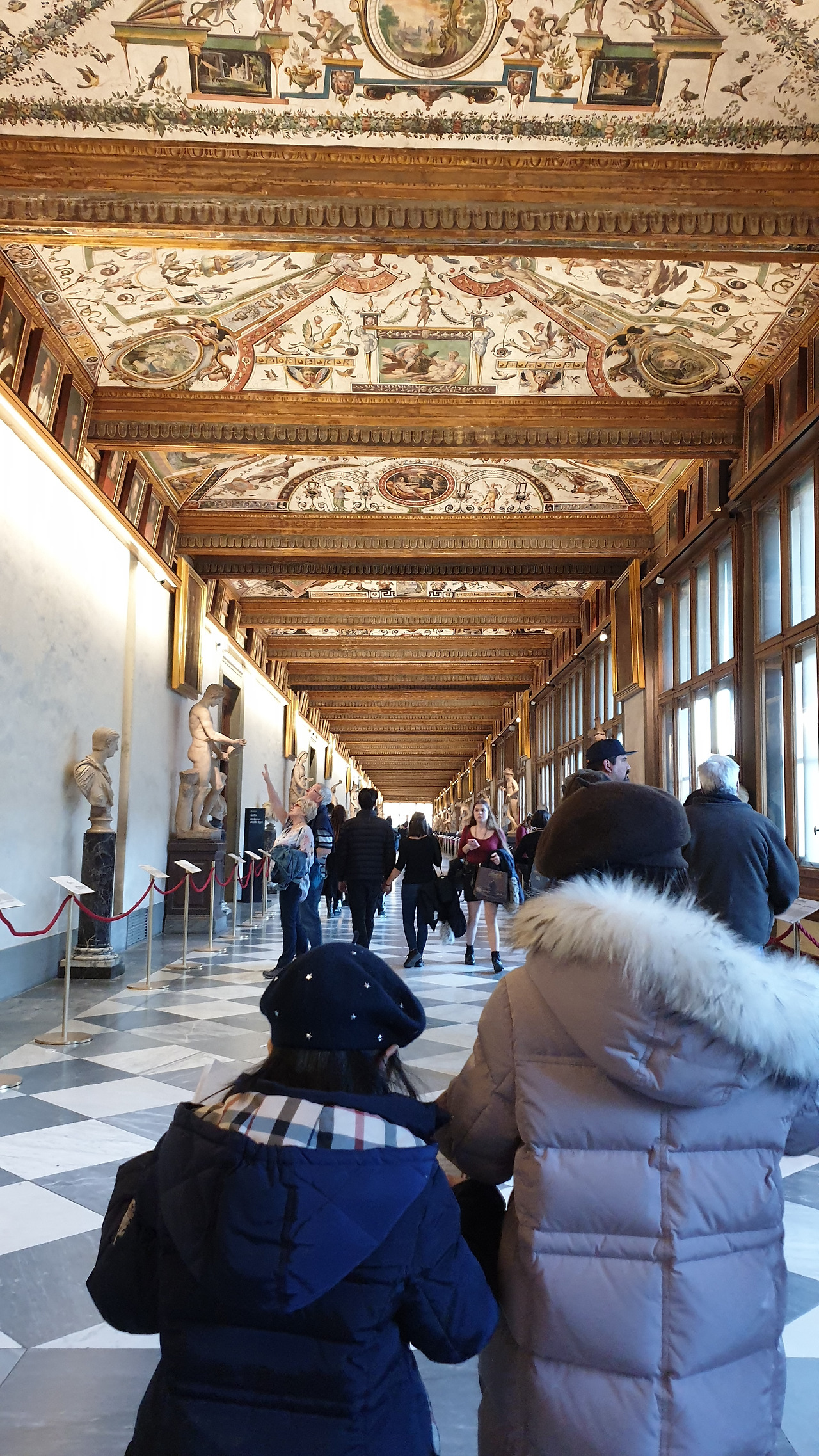 르네상스의 시작과 절정, 그리고 바로크로 이어지는 흐름을 감상할 수 있는 우피치 미술관은 원래는 시관 공서로 사용된 르네상스 양식의 건물이라 반듯반듯한 좌우 대칭의 건물이 인상 깊었다. 메디치 가문의 마지막 후손이 피렌체시에 기증하면서 수많은 소장품들 중 회화작품이 모여있는 곳으로 보티첼리의 <비너스의 탄생>을 볼 수 있다는 생각에 마음이 들썩들썩였다.
