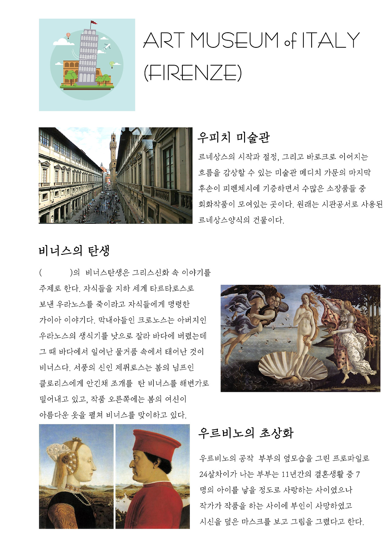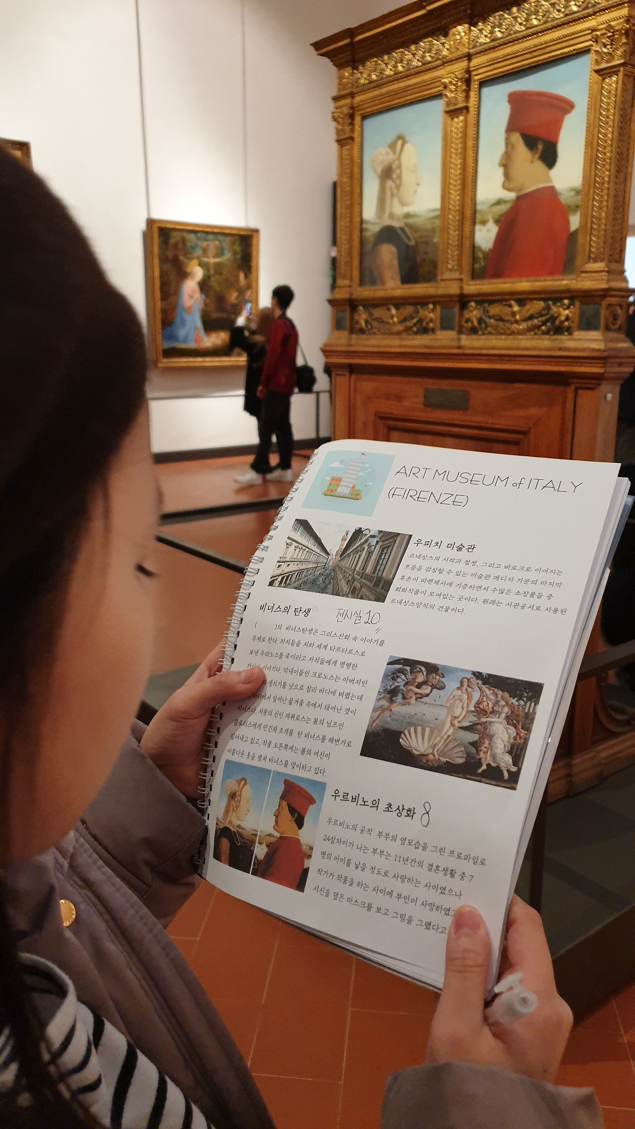 드디어 이탈리아 르네상스의 대표 화가인 보티첼리의 <비너스의 탄생> 앞에 조용히 다가갔다. 물거품 속에서 태어난 비너스의 자태는 가히 아름답다 표현하기 아쉬울 정도로 더 알맞은 형용사를 찾기 어려웠고, 아이들은 비너스 탄생의 그리스 신화 이야기를 유럽 워크북에서 읽어가며 그림과 대조해보았다.