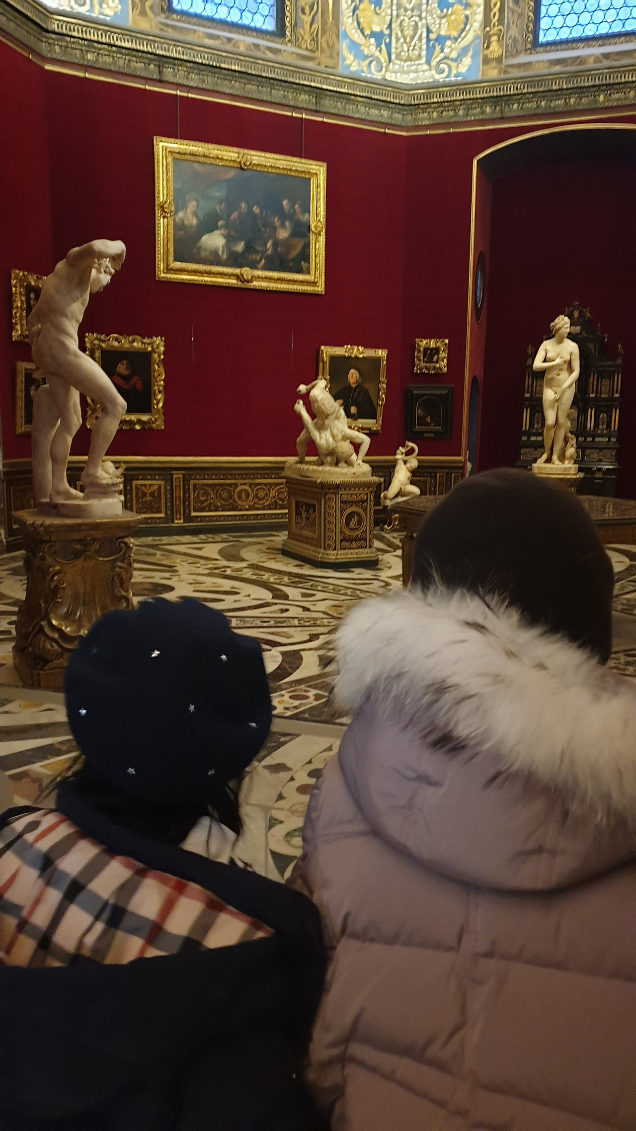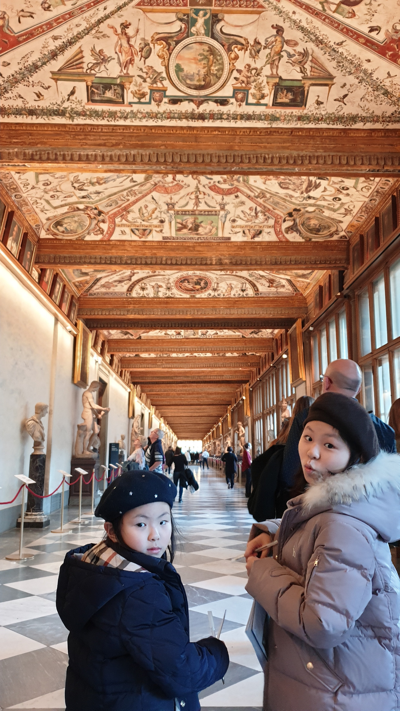 우리는 엄마표 유럽 워크북에 있는 대표적인 작품을 위주로 차근차근 살펴보기로 했다. 우피치 미술관의 작품은 간결하고 소박하게 전시되어있었고, 마음이 조급 해지는 여느 붐비는 미술관보다 마음이 더욱 차분해지고 여유로웠다.