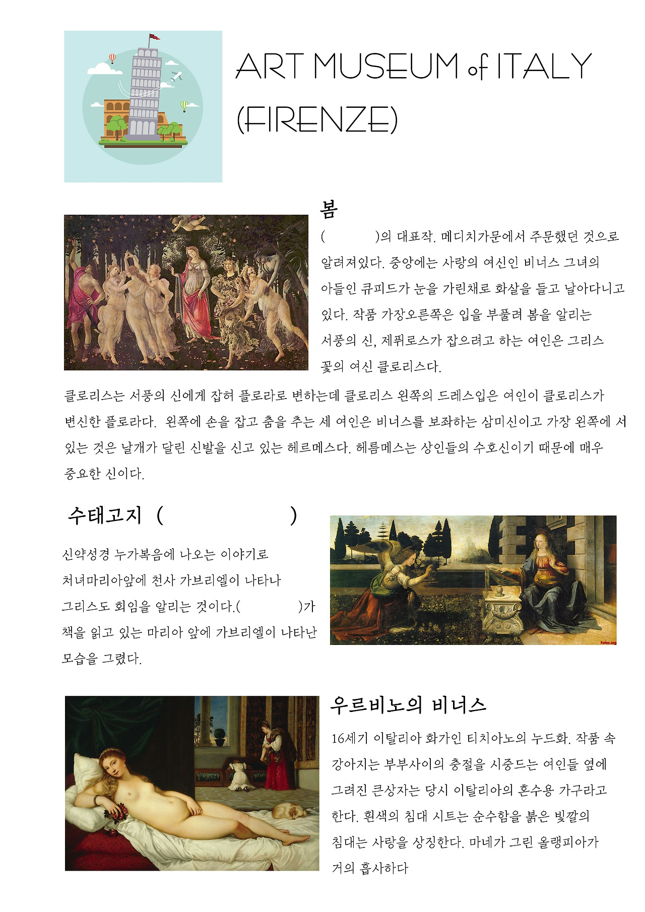 보티첼리의 대표작 <봄의 향연>은 입을 부풀려 봄을 알리는 서풍의 신, 비너스의 아들인 큐피드가 눈을 가린 채로 화살을 들고 날아다니고, 제피로스가 잡으려고 하는 꽃의 여신 클로리스와 날개가 달린 신발을 신고 있는 헤르메스까지! 이 작품은 그리스 신화에 대해서 더욱 궁금증을 자아내는 계기가 되었고, 한국에 돌아와서 아이들이 그리스 로마 신화에 더욱 푹 빠지게 되었던 근간이 되었다.