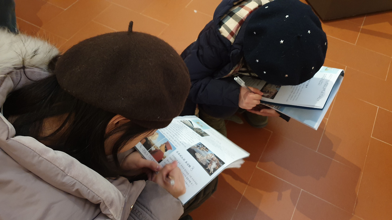 <수태고지>는 처녀 마리아 앞에 천사 가브리엘이 나타나 그리스도 회임을 알리는 것으로 왼쪽 45도에서 보면 원근법을 잘 볼 수 있다고 하여 아이들은 45도로 고개를 갸웃 기울여보기도 하고 요리조리 잘도 감상하였다.