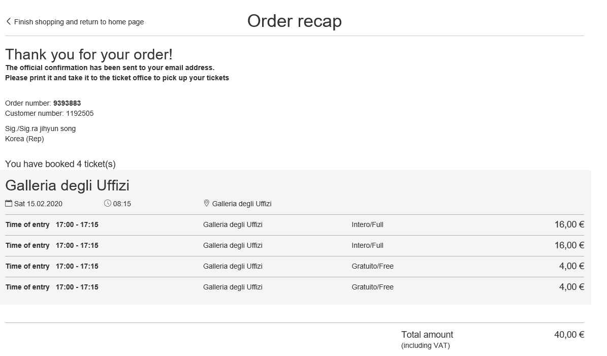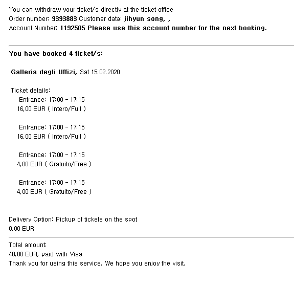 우피치 미술관은 입장권 예매제를 실시하고 있어서 인터넷으로 미리 예매를 하였고, 예약증을 가지고 실물 티켓으로 교환할 수 있었다.