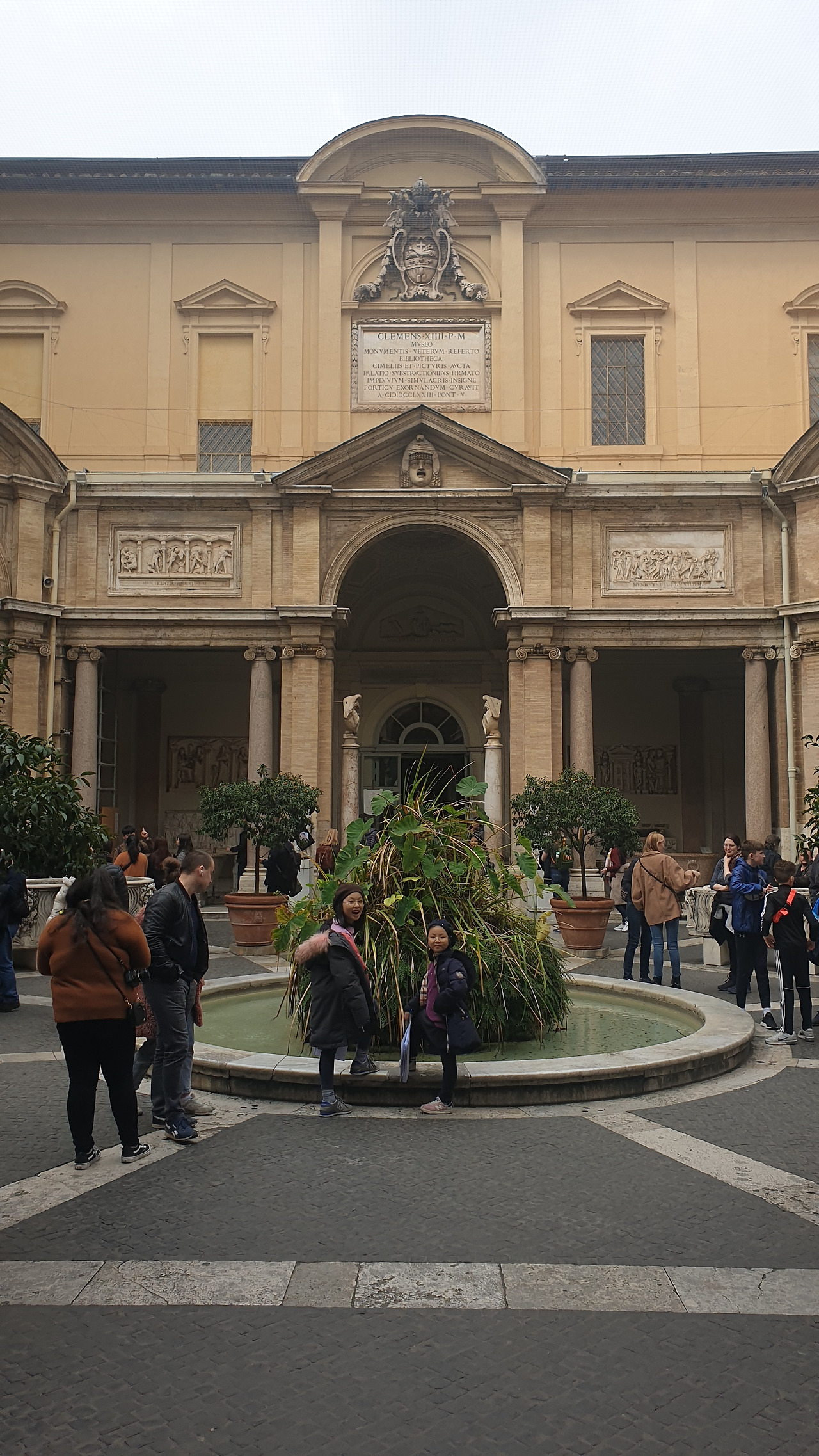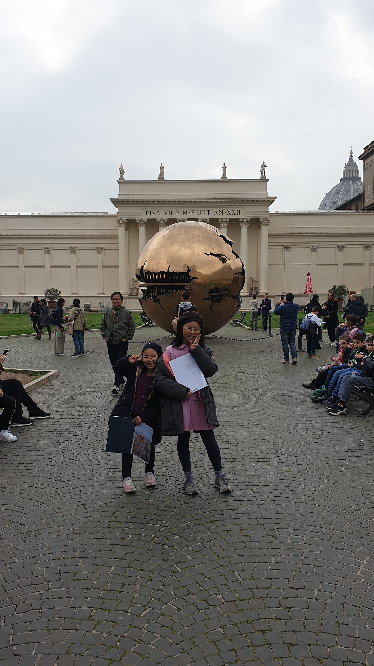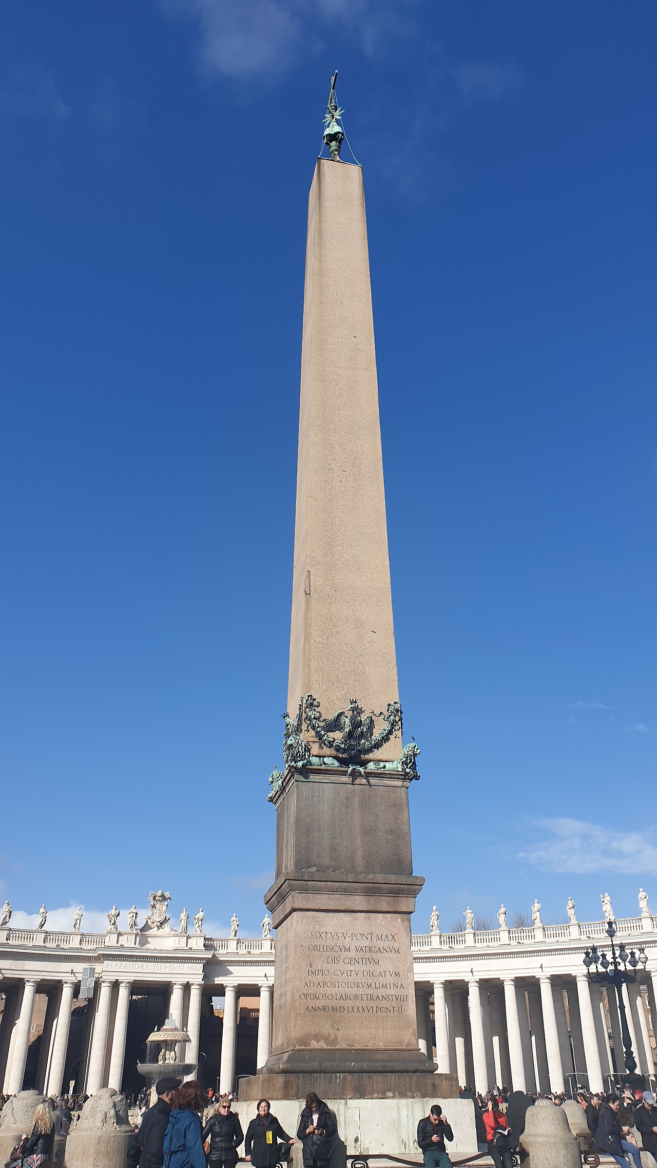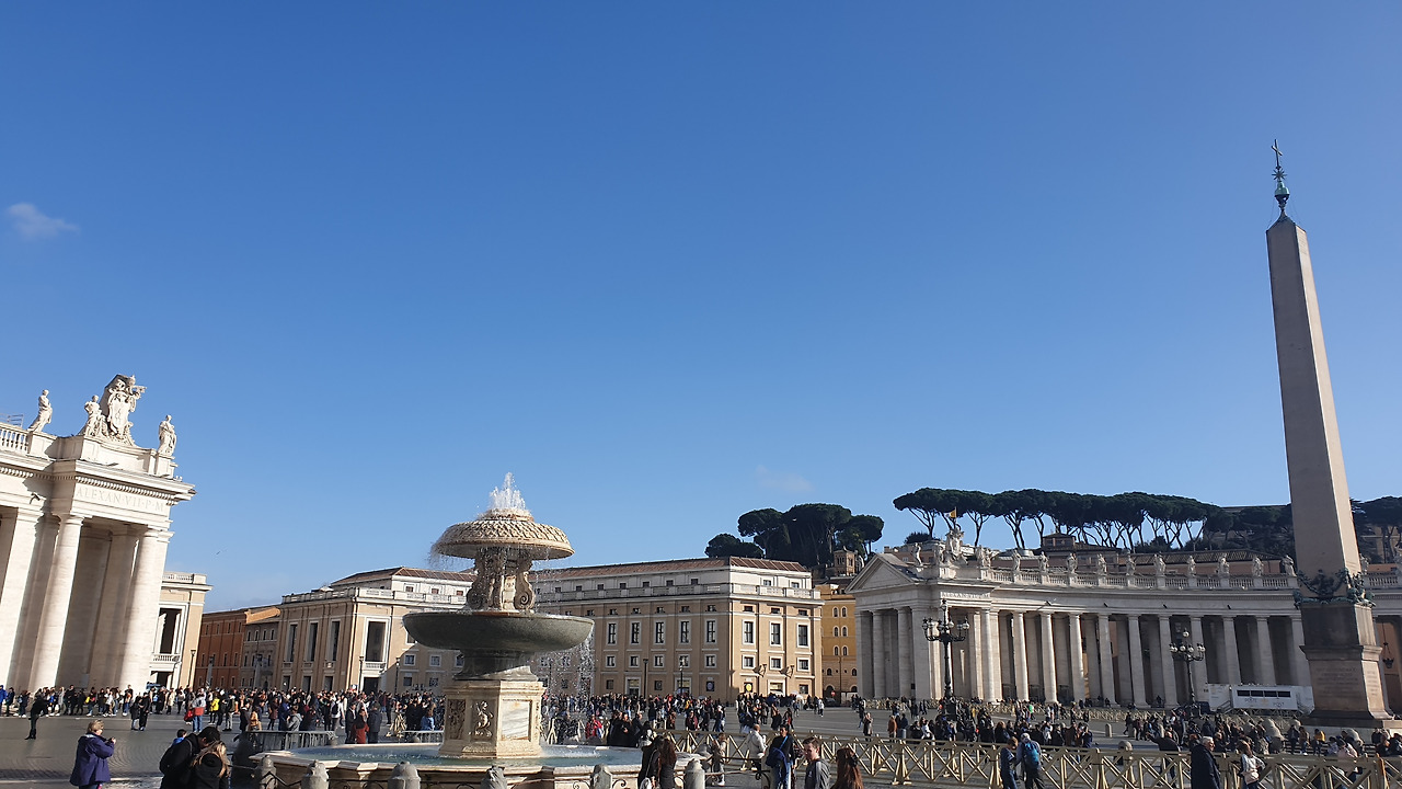 몸과 마음이 이미 지친 우리는 산 피에트로 광장에서 한숨을 돌리기로 했다. 이미 산 피에트로 대성당을 입장하기 위한 줄은 산 피에트로 광장을 휘감아 돌고 있었고, 번갈아가며 대기줄에 한 사람이 남고 나머지는 사진 찍으며 구석구석을 돌아보기로 했다. 베르니니의 수학적 재능을 엿볼 수 있는 표시물에 서서 4열로 이루어진 기둥들이 한 개로 겹쳐 보이는 지도 살펴보았다. 오랜만에 햇살이 쏟아지는 날씨에 탁 트인 광장을 보고 있으니 사람 지옥에서 고생한 기억이 한 움큼 사라졌다.