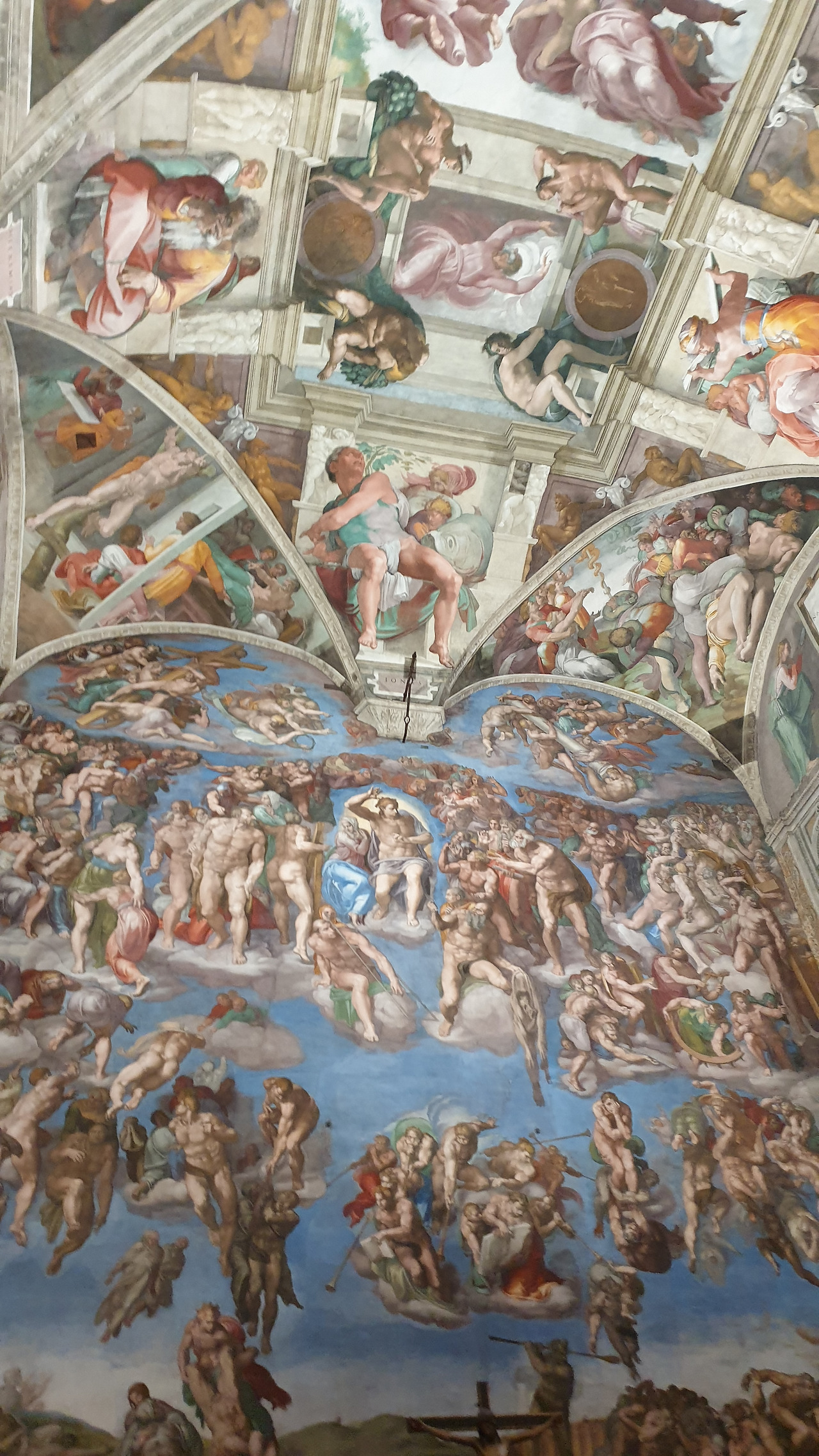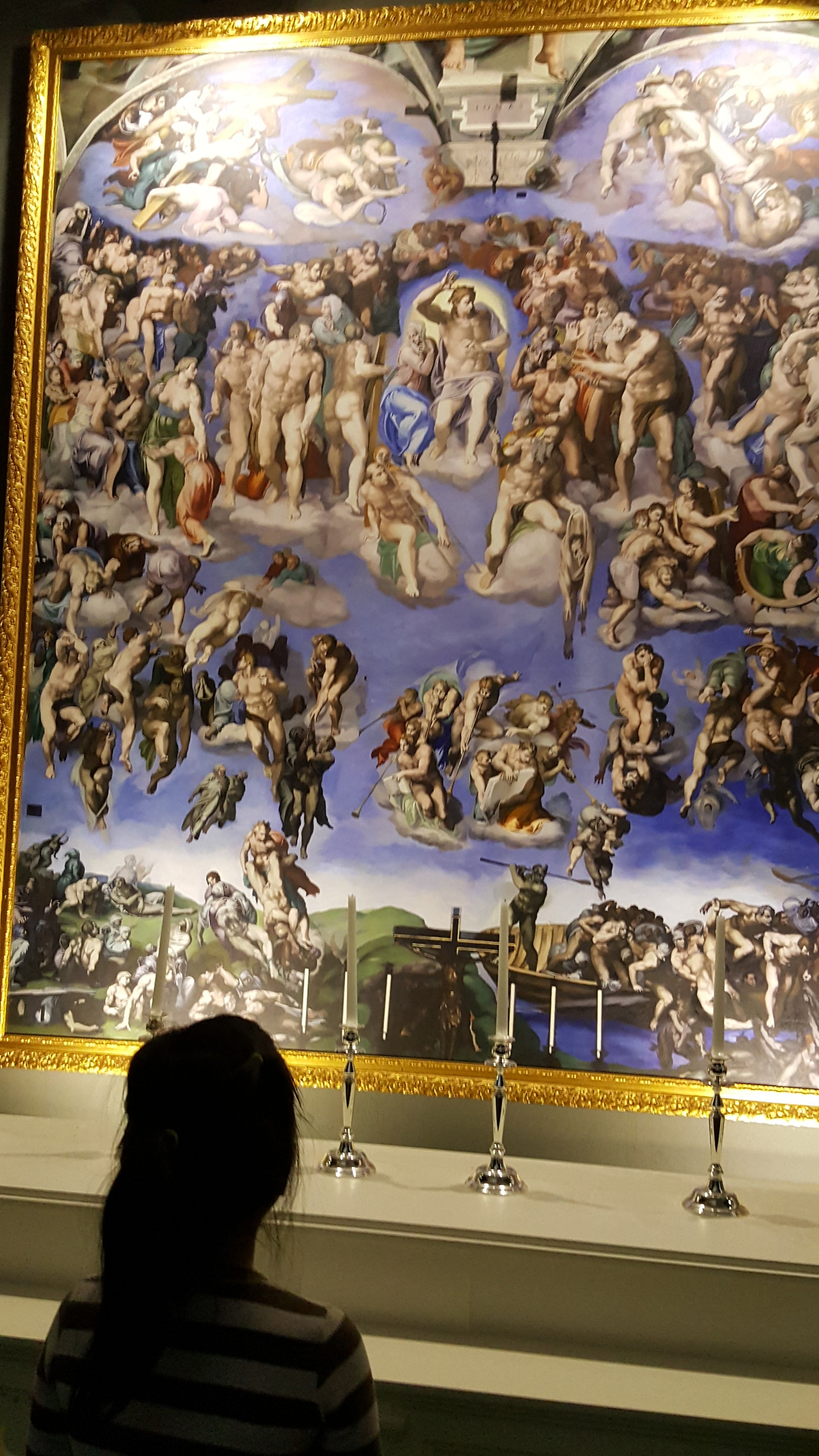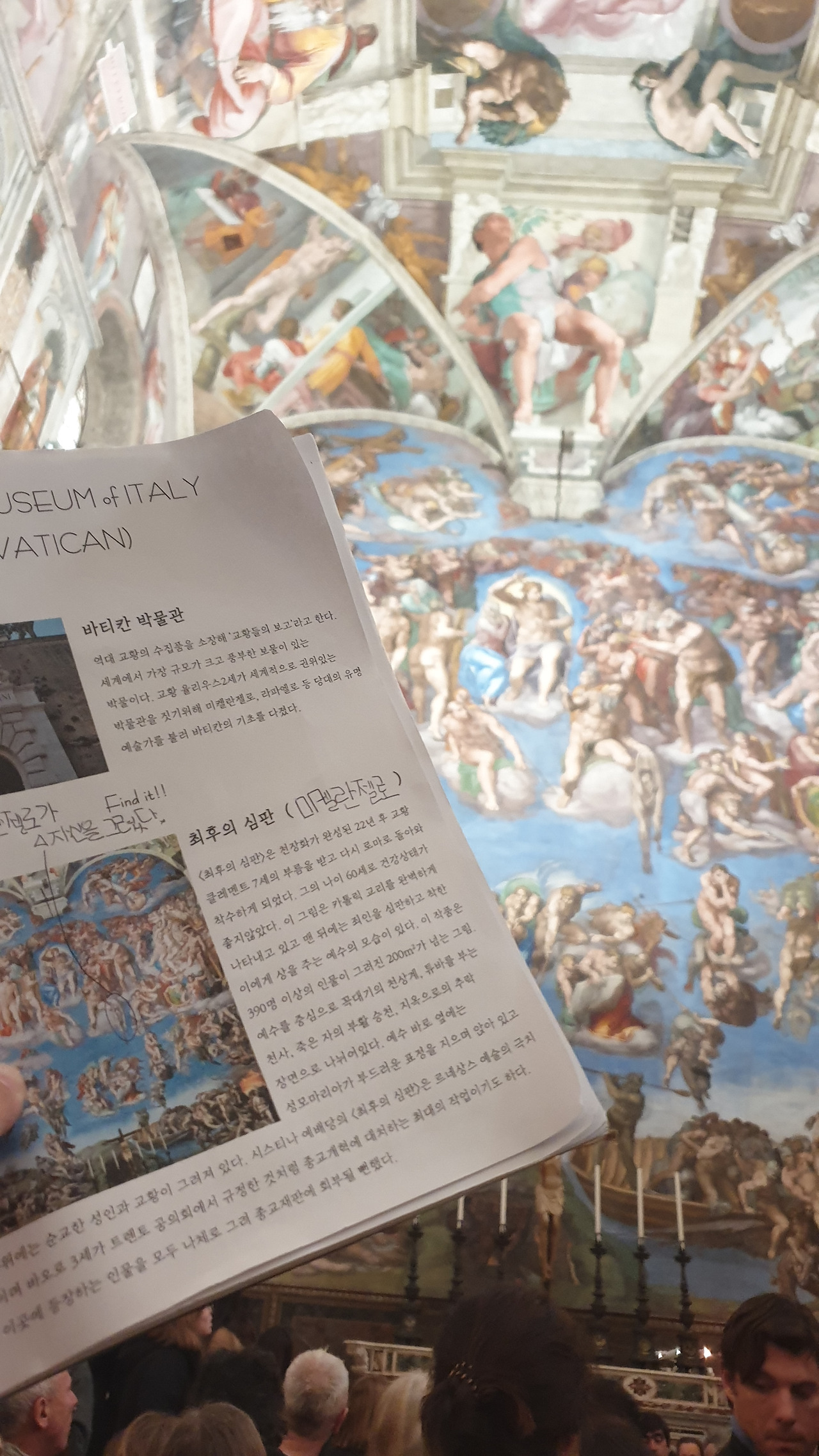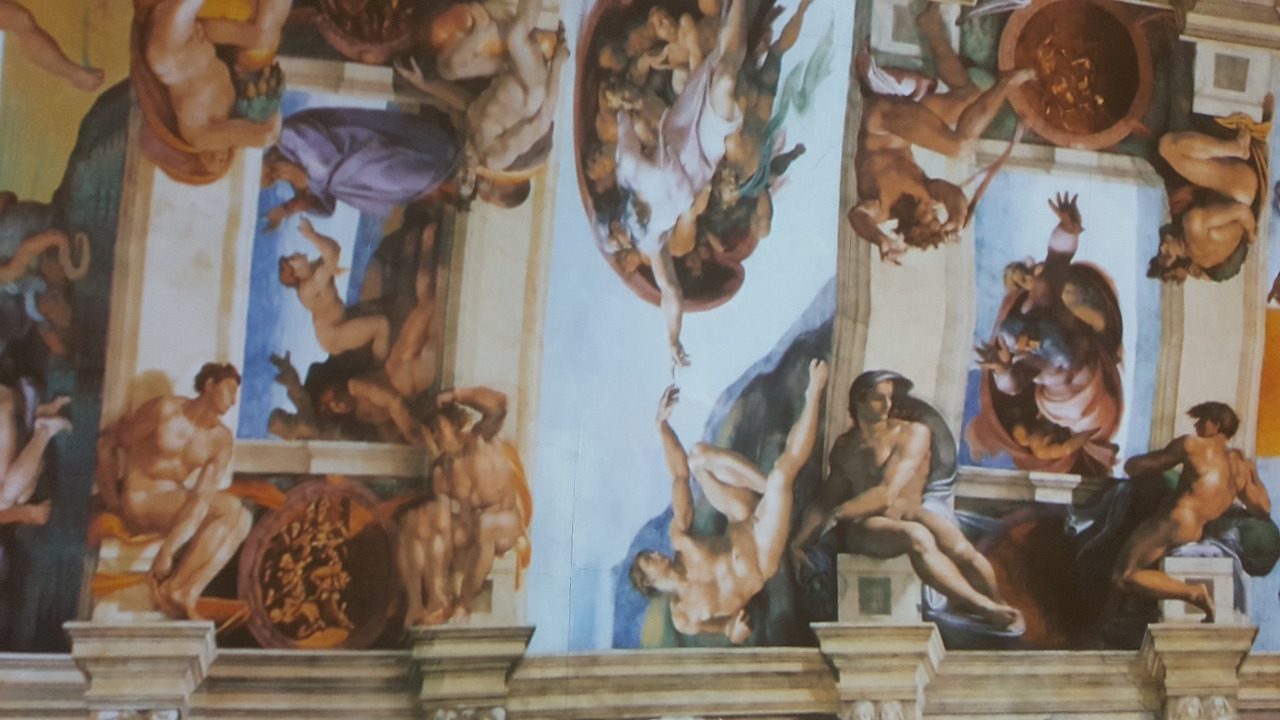 바티칸 박물관의 수많은 작품은 사람들에게 치여서 우리에게는 아무런 감흥이 없었고 단지 우리는 미켈란젤로의 <천지창조>와 <최후의 심판>을 실물로 만나겠다는 일념 하나로 멘털을 붙들어 매었다. 드디어 <천지창조>와 <최후의 심판>을 만나는 순간! (사실 이것도 사람들 인파 속에서 오래 보면 눈치가 보여 얼마나 조마조마 감상했는지 모른다) 미켈란젤로의 압도적인 규모의 <천지창조>를 목이 꺾어져라 올려다보았다. 미켈란젤로의 천장화를 그린 후유증인 목디스크와 시력저하는 감상한 지 몇 분도 안되어 백번 공감되었고 미켈란젤로의 거대한 작품 규모와 신의 경지에 이르는 천재성에 압도당해 우리는 한동안 말을 잃었다.
