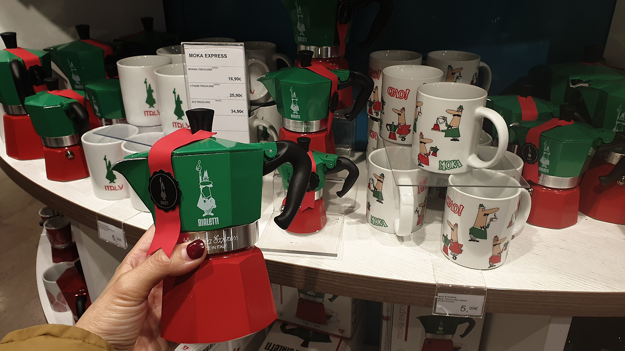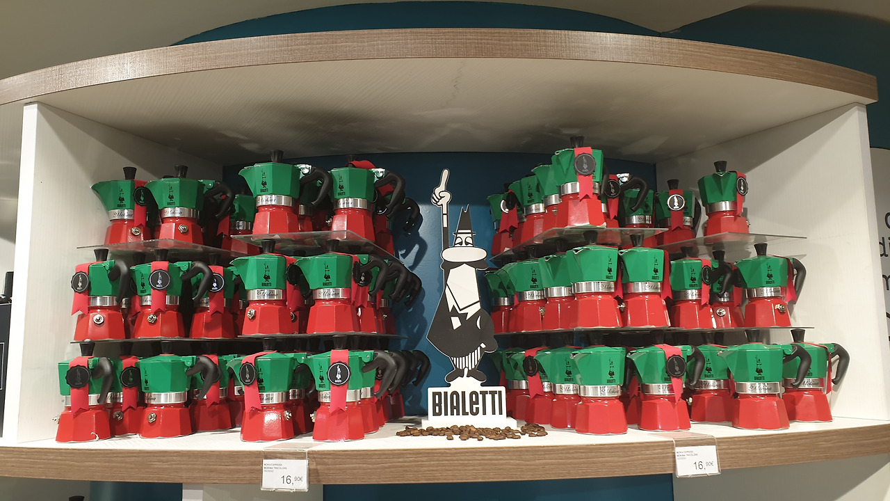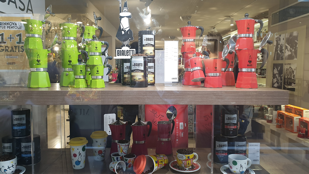 숙소로 돌아오는 길 후미진 골목골목에 만난 상점은 구경거리로 넘쳐나서 한걸음 가다 서다를 반복하게 만들었다. 베네치아의 화려한 축제를 간접적으로 느낄 수 있는 화려한 가면과 개성이 넘치는 의상과 가죽제품이 즐비하였고 구경하던 중에 발견한 비알레티 모카포트 매장을 발견한 엄마 사람의 눈은 휘둥그레진다.