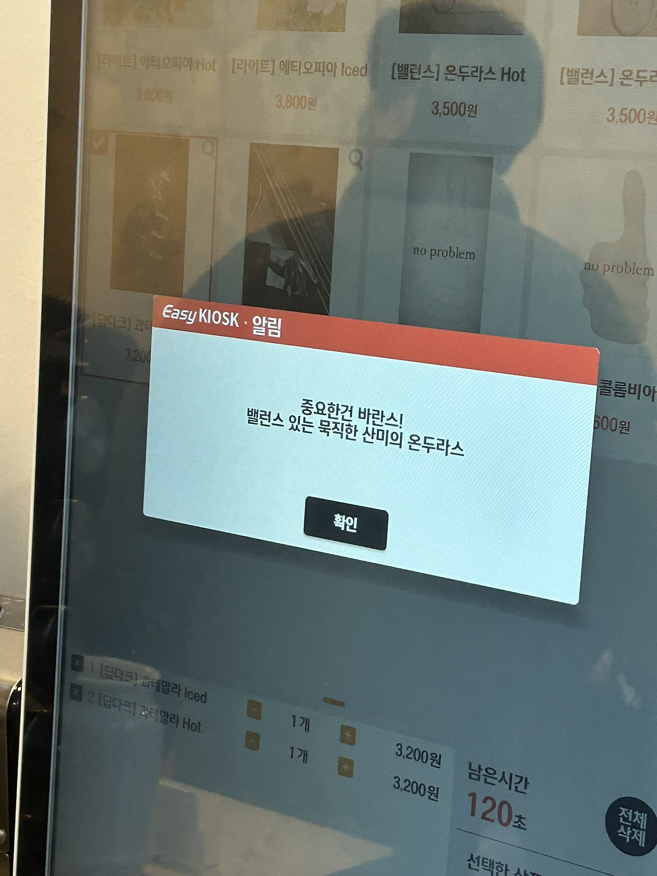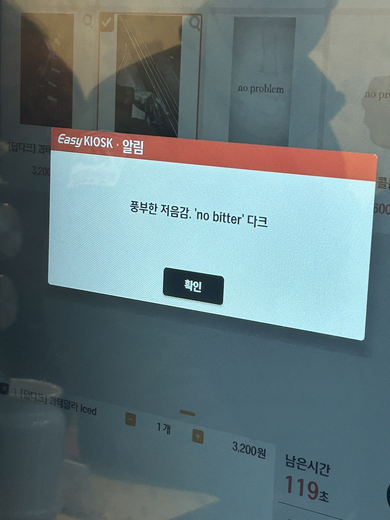 우연히 길을 지나가다가 발견한 cafe입니다. cafe를 많이 다니다 보면 간판만 보아도 ‘coffee가 맛있을 것 같은’ 느낌이 오곤 하는데 여기도 그런 느낌이 들어 즉흥적으로 들어갔습니다. 키오스크로 주문을 하는 순간 메뉴 설명의 팝업 알림창이 인상 깊었습니다.