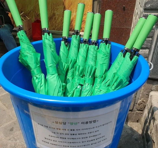 사진과 같이 무더운 여름날 웨이팅을 하는 고객을 위해 양산을 제공하여 뜨거운 자외선을 차단해 기다리는 시간의 고통을 덜어줍니다.