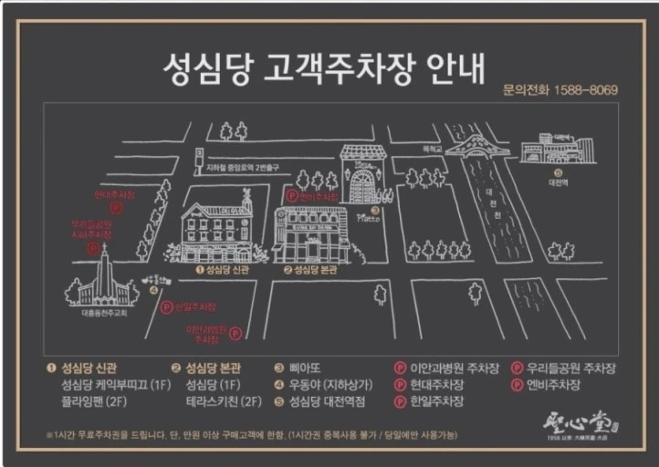 주로 먼 거리로부터 차량으로 방문하는 고객들을 위해 주차장을 이용할 수 있는 친절한 안내지를 제공해 줍니다. 또한 신관과 본관의 위치를 제공해 주어서 더욱 편하게 찾을 수 있습니다.